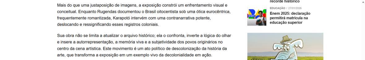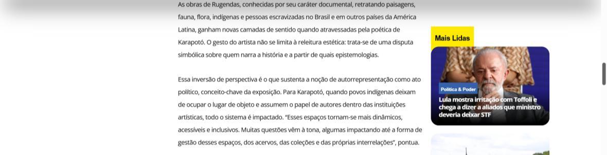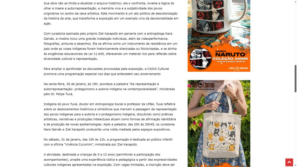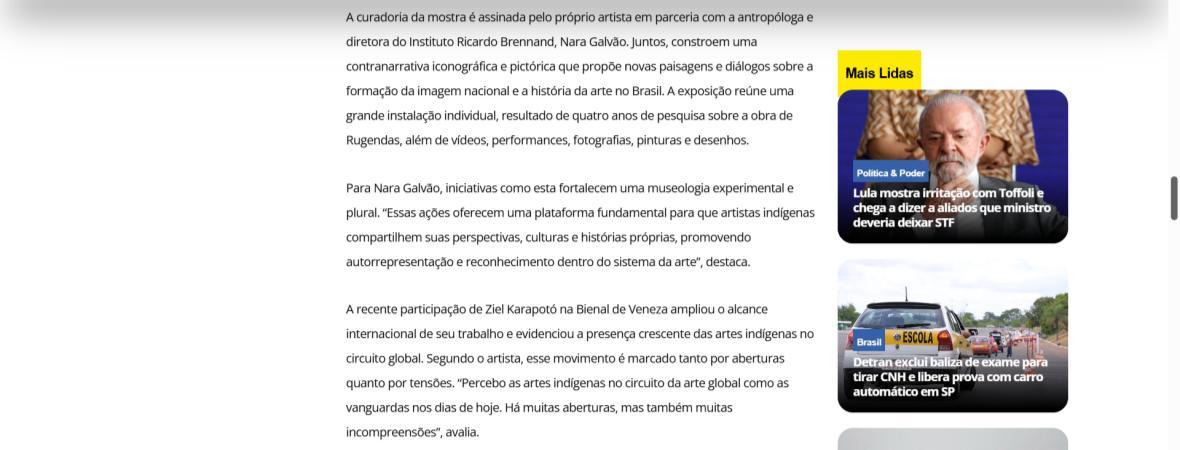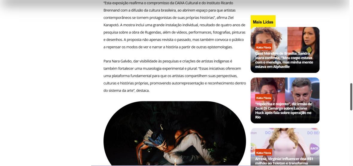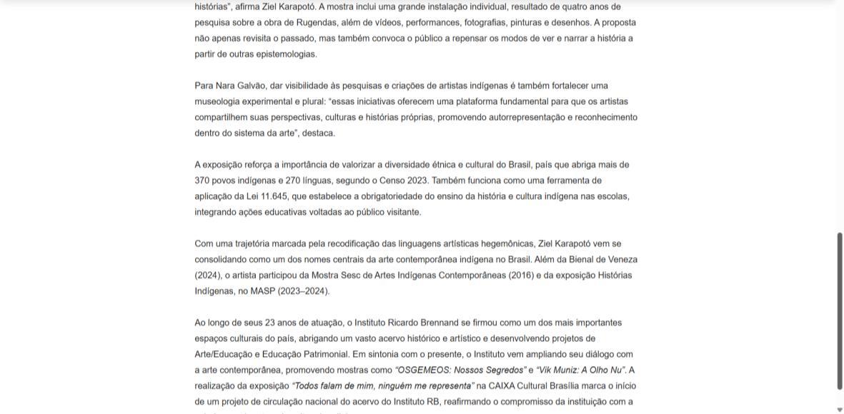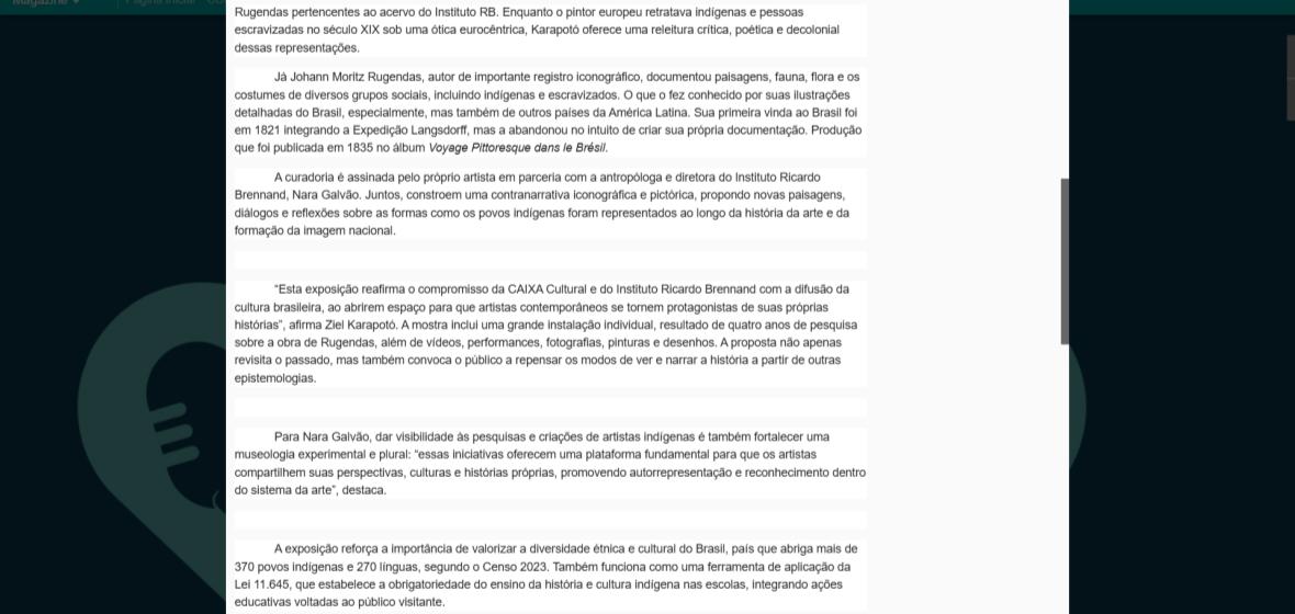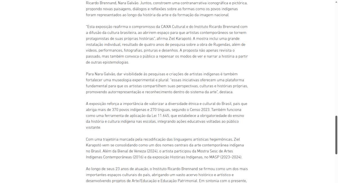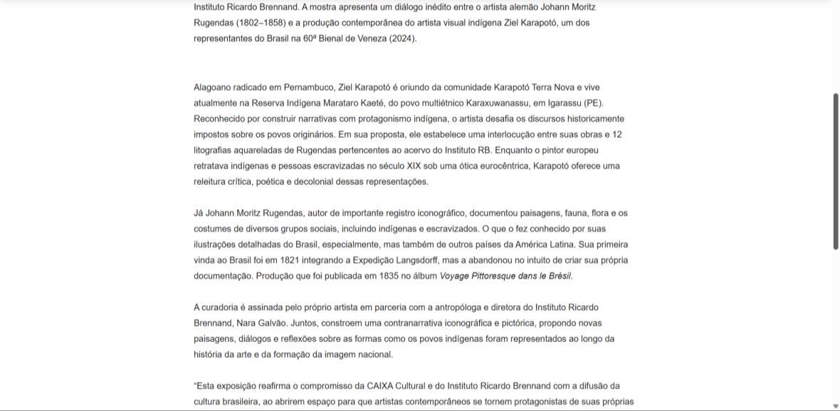 “Esta exposição reafirma o compromisso da CAIXA Cultural e do Instituto Ricardo Brennand com a difusão da cultura brasileira, ao abrirem espaço para que artistas contemporâneos se tornem protagonistas de suas próprias histórias”, afirma Ziel Karapotó. A mostra inclui uma grande instalação individual, resultado de quatro anos de pesquisa sobre a obra de Rugendas, além de vídeos, performances, fotografias, pinturas e desenhos. A proposta não apenas revisita o passado, mas também convoca o público a repensar os modos de ver e narrar a história a partir de outras epistemologias.