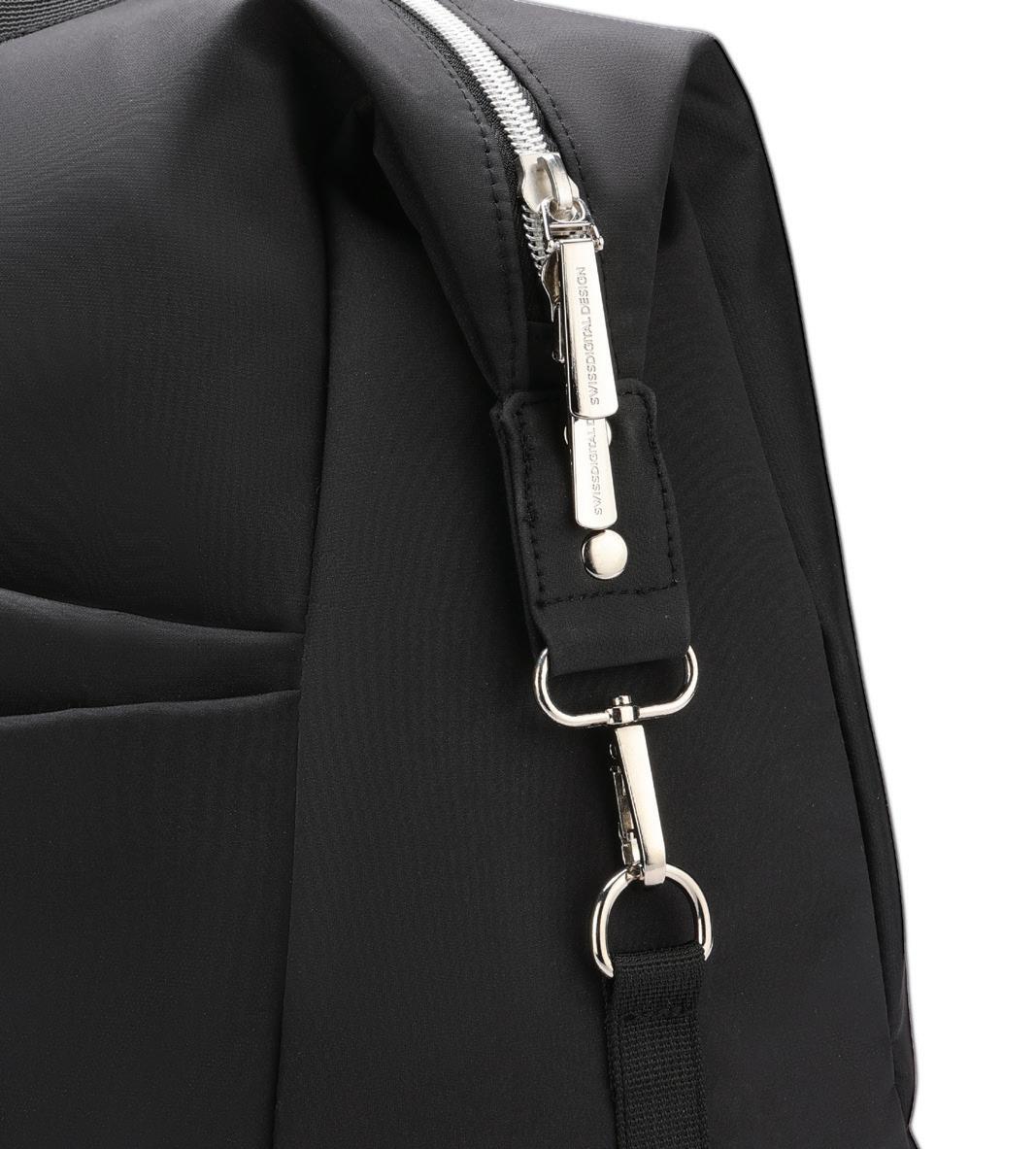 2 side drawstring pockets converts from tote to backpack large front zip pocket 15" laptop compartment