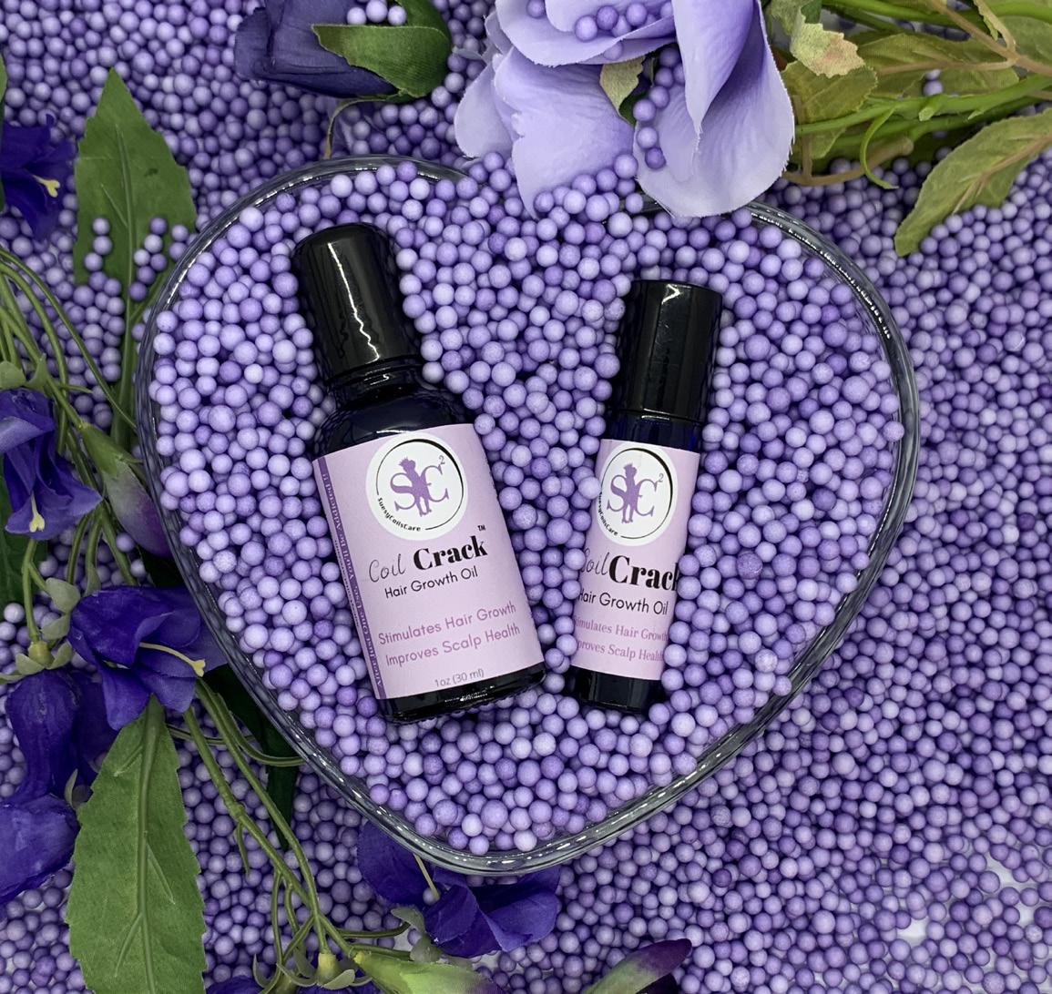 She shares The Coil Crack™️ Hair Growth Oil- RollerBall stimulates hair growth, moisturizes hair and scalp, may prevent hair loss and breakage, treats dandruff, treats premature graying, kills bacteria on the scalp, and improves scalp health. It is infused with fenugreek, rosemary, lemon, peppermint, tea tree, and lavender. The RollerBall bottle is good for braids (of any kind), short beards, edges, bald spots, and traveling. The massaging from the roller ball helps stimulate growth as well. This application will not leave your fingers oily.