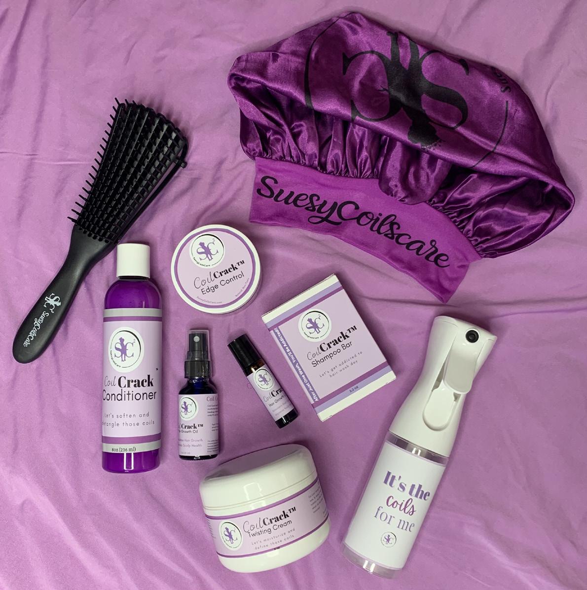 The SuesyCoilsCare is a truly diverse line of hair care products and includes the basic essentials for taking care of your hair. There is the Coil Crack™️ Hair System, the Coil King Collection, the SuesyCoilsCare Bonnet, SuesyCoilsCare Skin, and various Coil accessories. The Coil Crack™️ System consists of Shampoo bars, Conditioner, Hair Growth Oil, Edge Control, and Twisting Cream. The products
