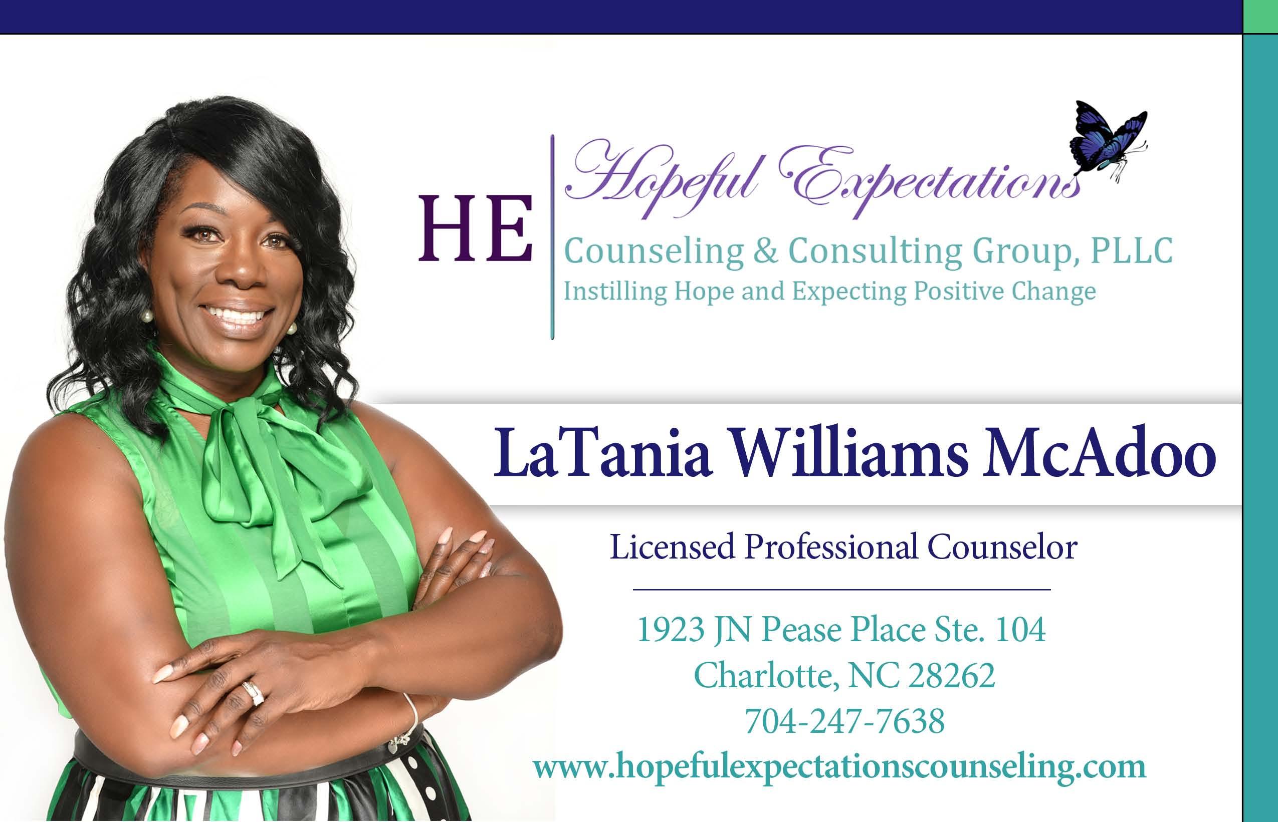 “I have always had a passion for helping people, which is why I chose to become a Therapist,” says LaTania Williams McAdoo, Licensed Professional Counselor and owner of Hopeful Expectations Counseling and Consulting Group, PLLC, located in the University Area of Charlotte, North Carolina. This new private practice specializes in helping committed couples work through the day to day conflicts that they face within their relationships.