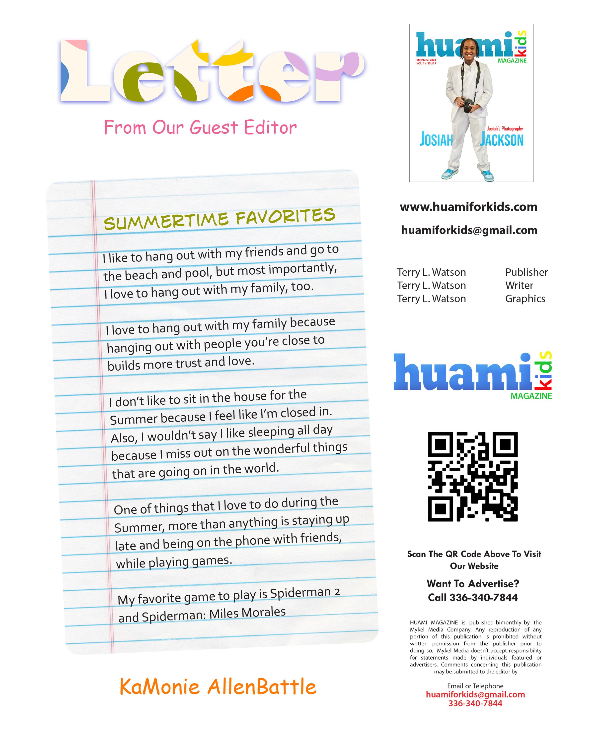 I have written a couple of books, and one is on Amazon called Melanin Magic: Empowering Notes for Young Minds. My other book is The Princess in the Woods, but I haven’t drawn the pictures for it yet. Writing makes me happy because I want kids like me to smile, believe in themselves, and know they can follow their dreams. Sometimes I pretend I’m the characters in my stories, and that helps me be a better actor too.