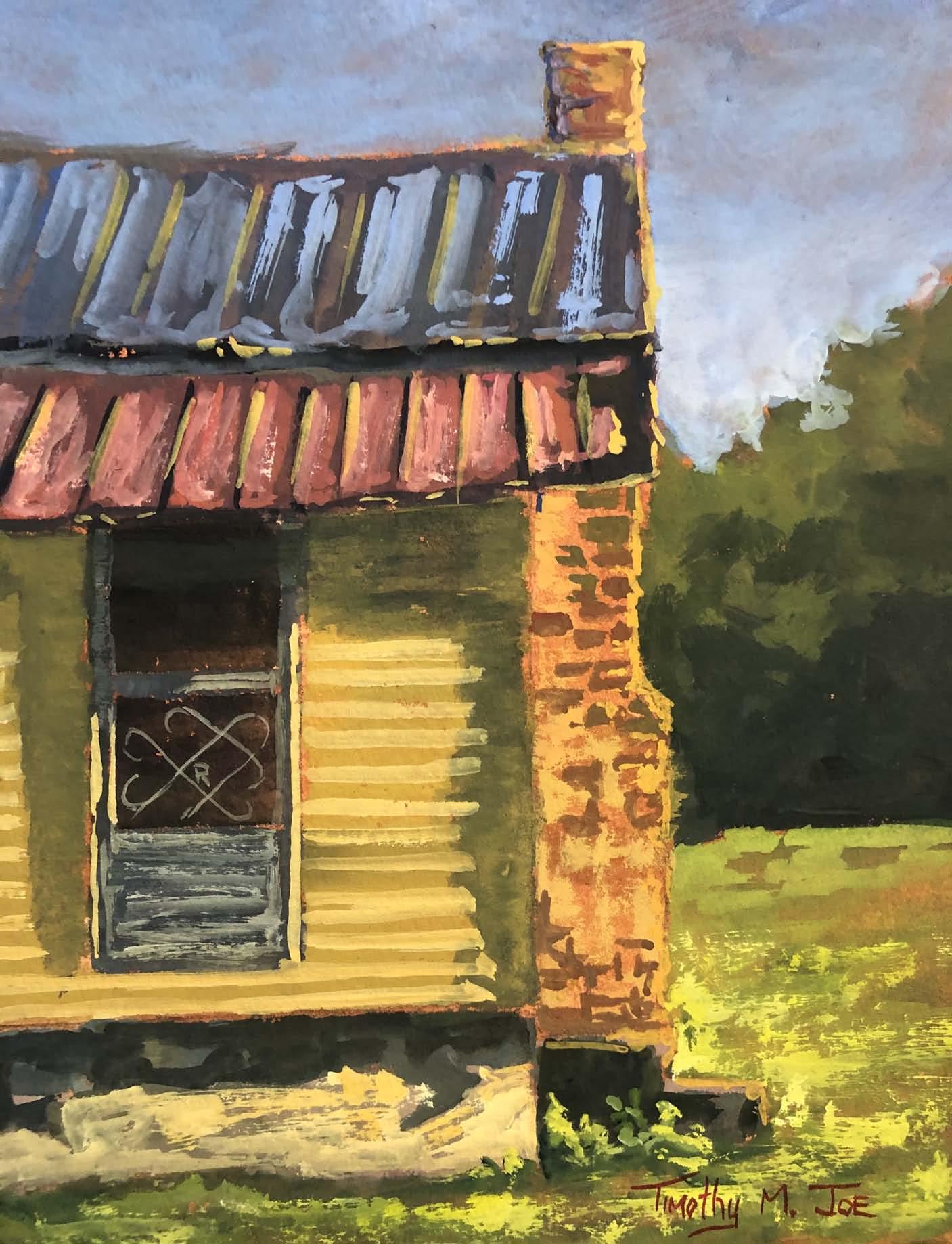 Timothy can see art in almost anything. He says that he is mostly inspired by the narrative in every scene that he paints. “Whether it comes in the form of an abandoned home that’s falling apart, family heirlooms, or landscape, I am able to make a connection. My role is to remain receptive and be ready to take a quick reference picture or sketch it in my art journal,” he says. “I love learning the history about my subject and gain the appreciation that helps me create meaningful art. Creating a beautiful painting is nice but painting the same scene with an understanding of the history is what I am after. I believe the backstory of my subject is just as important as the color I choose to paint.”