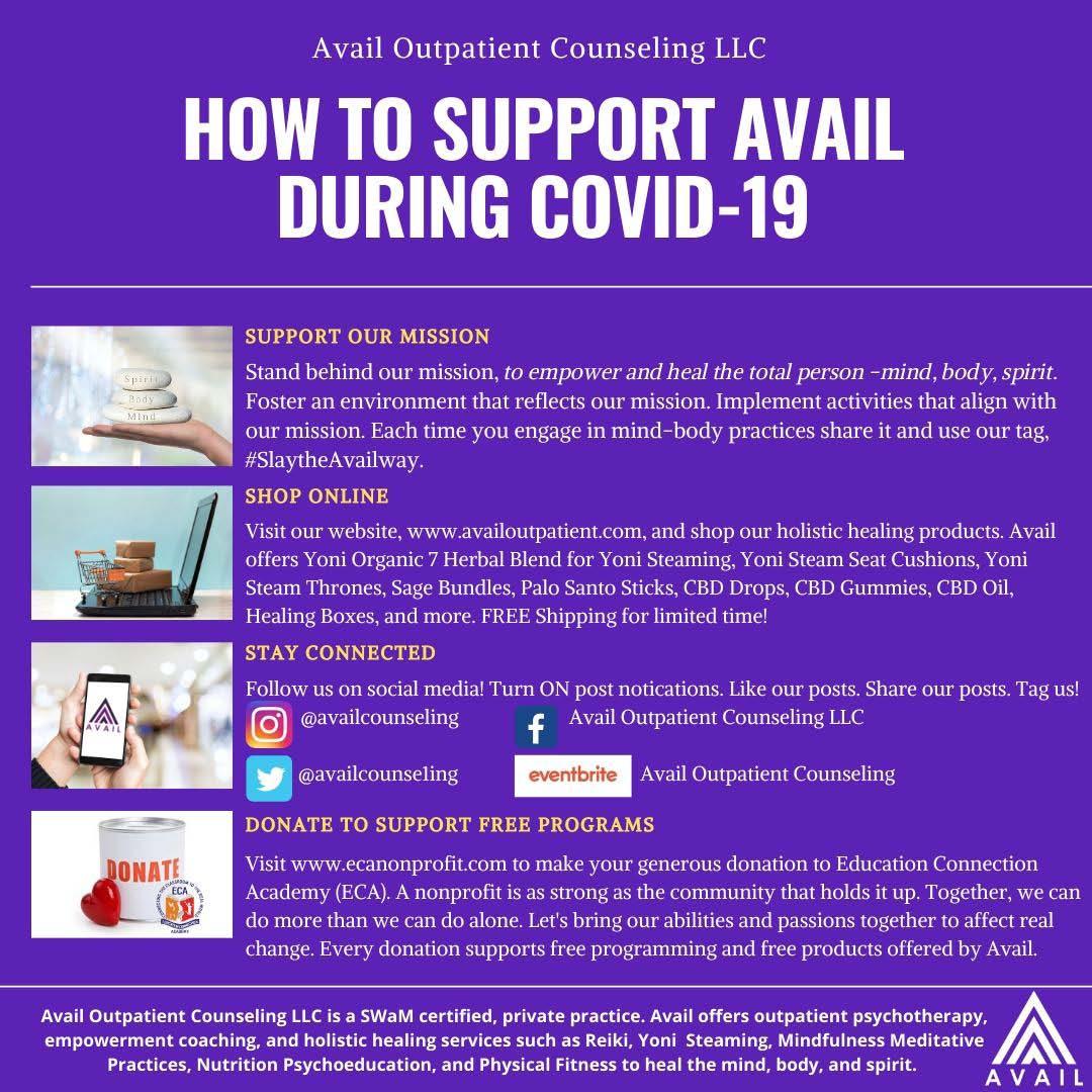 To learn more about Avail Outpatient Counseling LLC visit www. availcounseling.com. Attached is also a flyer that shares how to support Avail during COVID-19.
