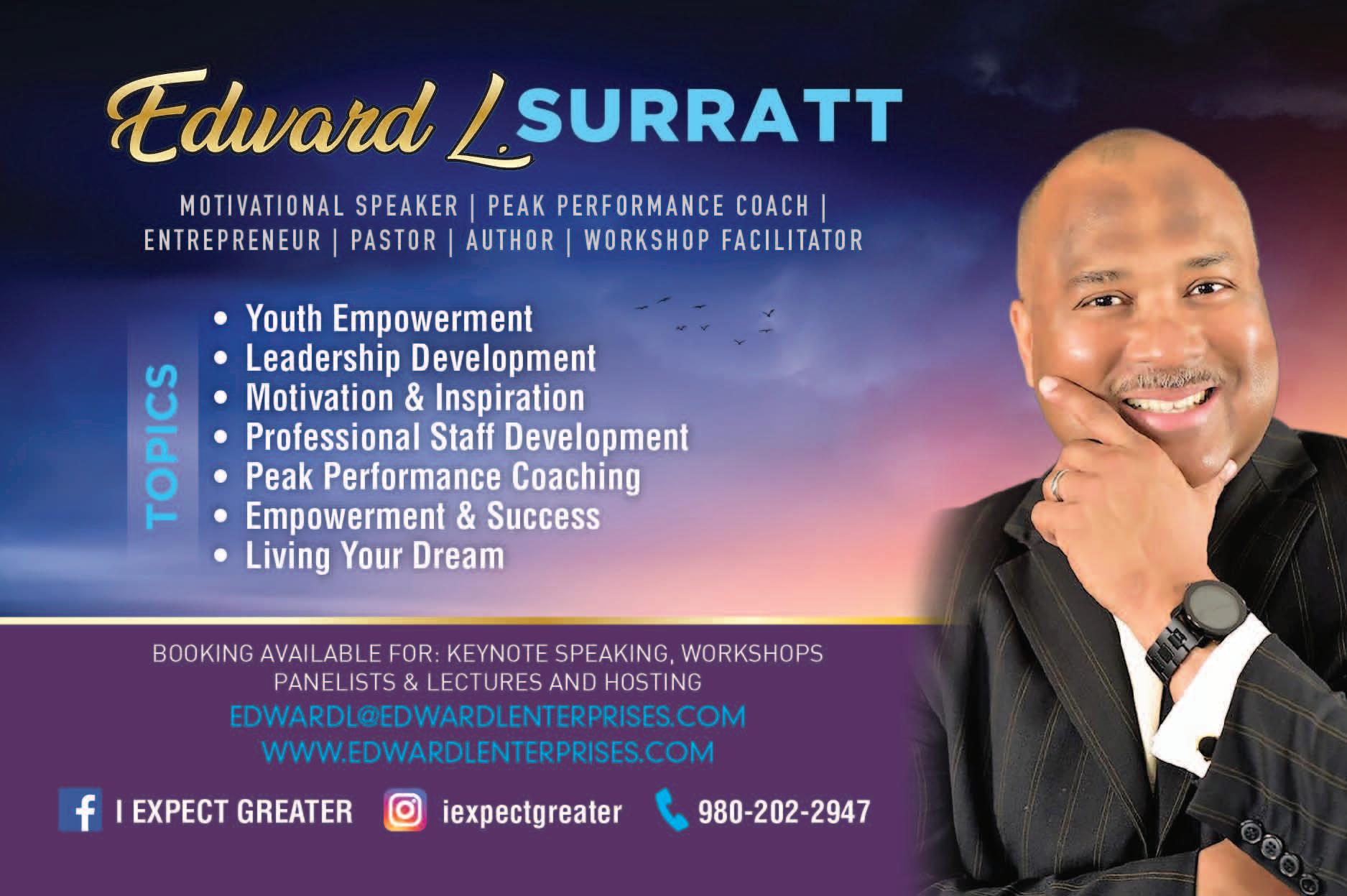 Be impactful, be in demand. Be international. That is the dream of Edward Surratt. Originally from Lincolnton, N.C., Edward is on a mission to educate and motivate as many people as he can. He wears many different hats, but with one consistent message; Expect Greater. Those words are more than a catch phrase or a business tagline Edward shares. “It’s a movement and a part of my ministry, and my motivation.