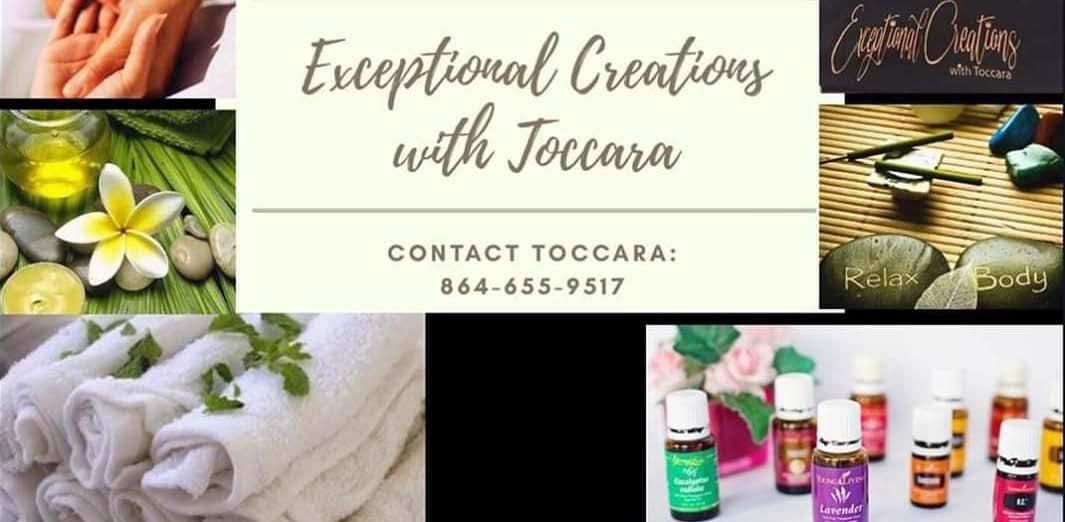 Toccara Lachell Samuel of Greenville, SC is a daughter, sister, aunt, and great friend to many people. She is also a licensed esthetician and founder of Exceptional Creations with Toccara LLC. Her company specializes in products for all natural hair growth and care, beard growth and care, skincare, and wellness. Additionally she has also served as a former Training Director for the Chick-fil-A food franchise.