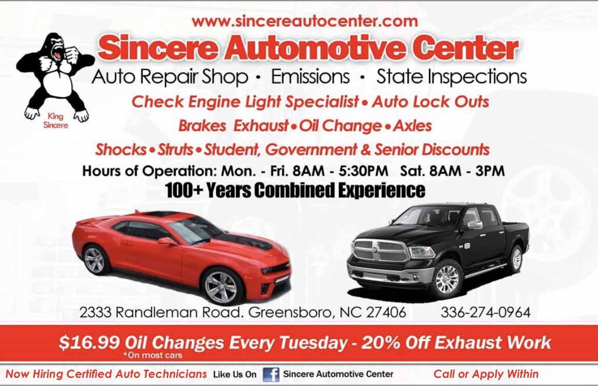 Sincere Automotive Center, LLC is a family owned and operated, full service, five bay auto repair shop. Their focus and specialty are servicing both foreign and domestic vehicles, and light duty trucks for business and residential customers within Greensboro and the surrounding area. By keeping the customer’s needs the number one priority, Sincere is able to offer the best automotive service possible. They are honest, friendly, reliable, and “sincere”. It all started with the vision and passion of one man, Celess Martin, Jr. Celess has always believed in going the extra mile by providing exceptional customer service, maintaining fair pricing, producing quality work all while educating his customers on how to stay safe on the road. With the help of Clarence Morehead, Jr. and Nella Jacsin-Becton, Sincere Automotive Center opened for business July 03, 2012, and has been growing ever since.