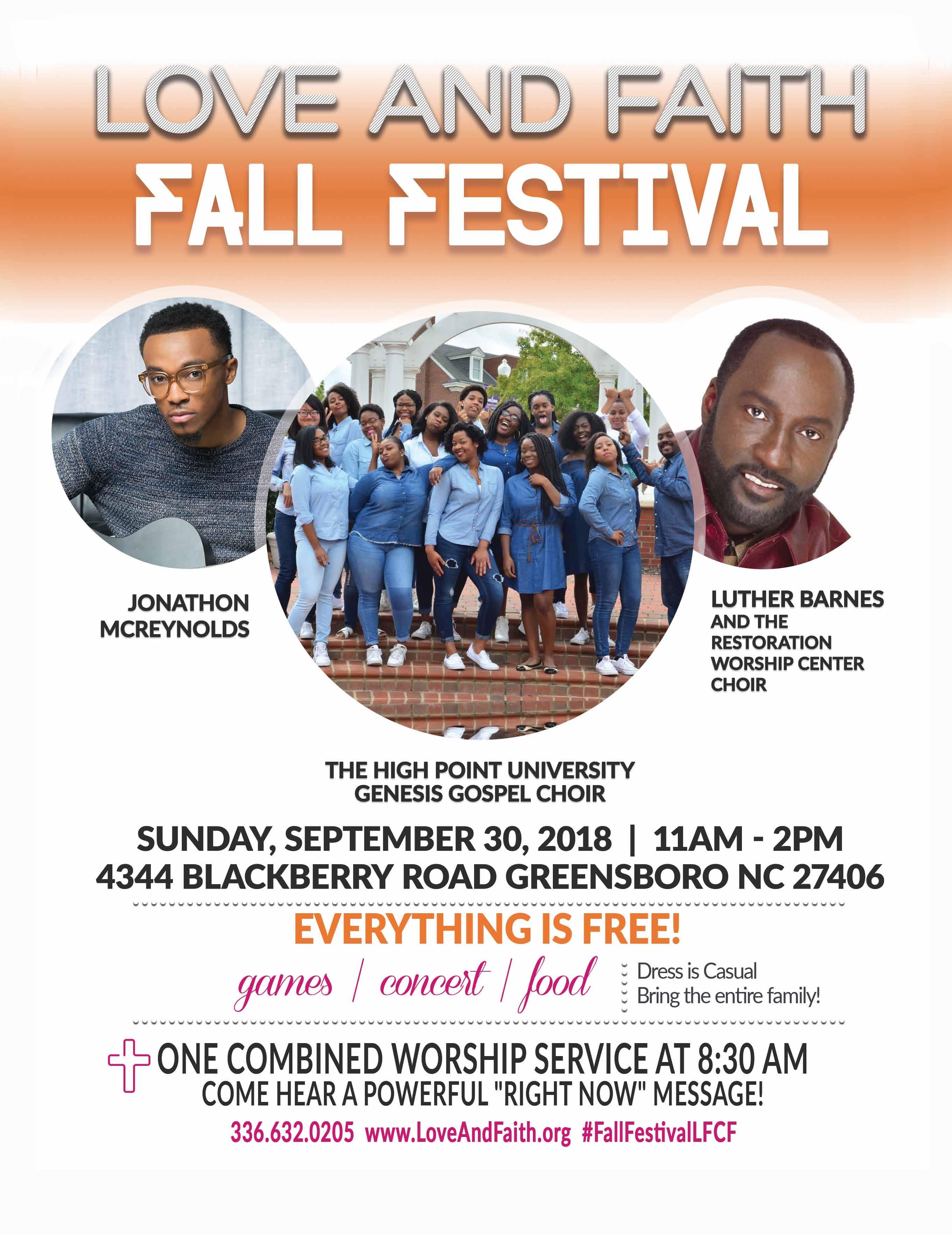 This year’s Love and Faith Christian Fellowship Fall Festival is Sunday, September 30th, 2018 and will take place on the Greensboro campus located at 4344 Blackberry Road. There will be one combined Morning Worship Service at 8:30 am, the dress is casual. Immediately following Morning Worship on the church grounds everyone is invited to enjoy free food, games, and a gospel concert featuring Luther Barnes and The Restoration Worship Center Choir, Jonathon McReynolds, The High Point University Genesis Gospel Choir and The Love and Faith Christian Fellowship Mass Choir at The Love and Faith Christian Fellowship Fall Festival. The church motto is “Where Jesus Christ Is Lord and The people are loved.” h