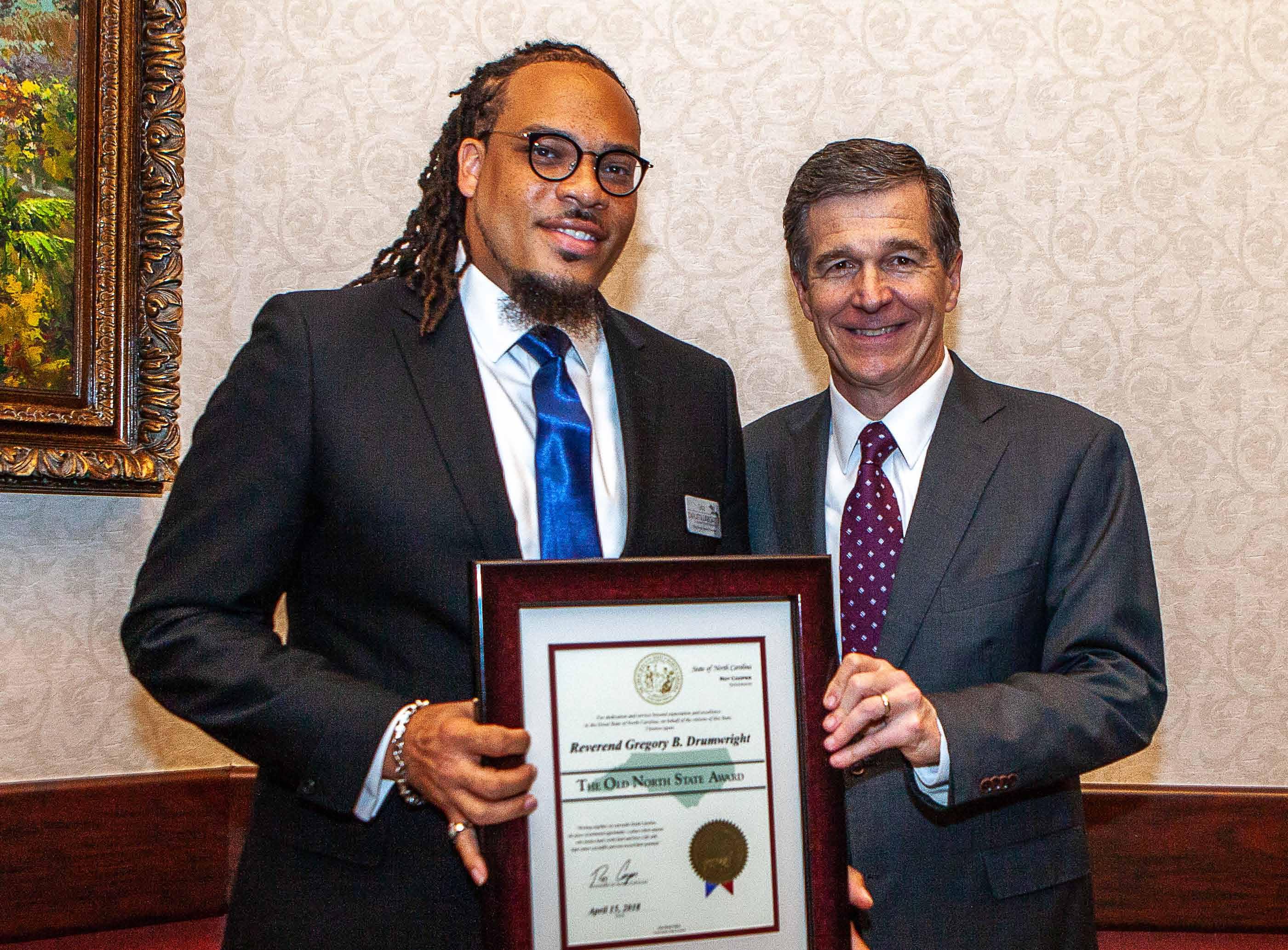 The Office of Rev. Gregory B. Drumwright announces the conferring of the Old North State Award by Governor Roy Cooper for 20-plus years of public service as a Minister, youth advocate, and community leader since 1996. His administration has also appointed him to the State Youth Advisory Council Board and Commission. In 1996 a 15-year-old Greg Drumwright began his mission as a community organizer of teenage youth through the establishment of a musical delegation that would lead him and his Gospel band, The Magnificent Voices of Praise, to the White House to answer two invitations, in 1998 and 1999 as well network TV appearances and major stages such as the World Famous Apollo Theatre. Upon sharing the story of his early successes Drumwright has one regret, it was all before the social media boom. “We didn’t have camera phones, YouTube or Facebook back then, which would have definitely made a major impact upon the awareness of my public ministry because most people don’t realize what I’ve been doing for as long as 20 or more years.” His band, as large as 40 members at one time, was awarded and celebrated many times over for its positive directions for youth in his hometown of Burlington, NC. That was only the beginning of his impact.