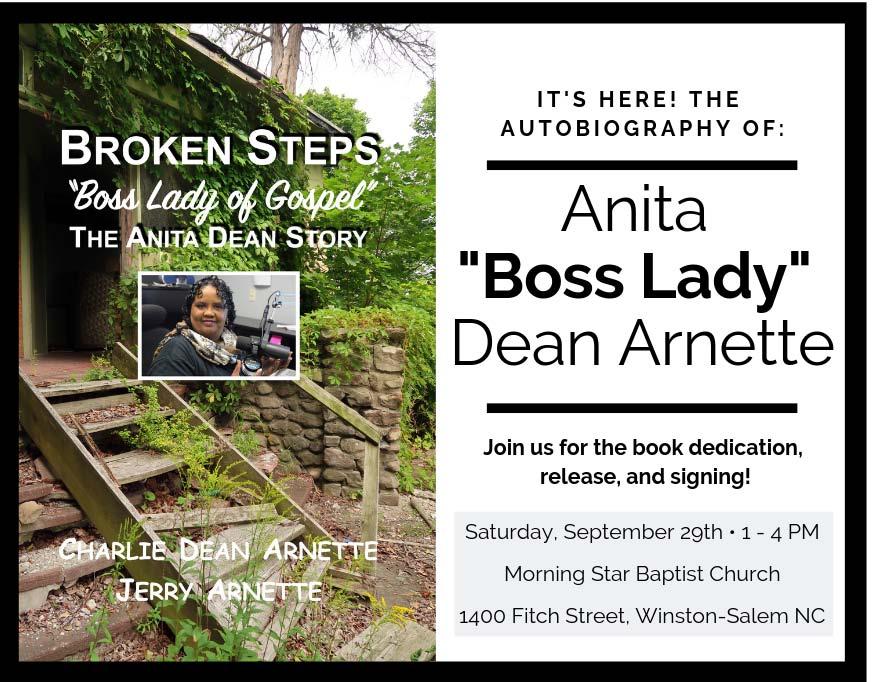 Anita Dean Arnette: Affectionately known as The Boss Lady of Gospel. No stranger in this community for over thirty (30) years, her voice has graced the airways not only in Winston Salem but the entire triad and other areas.