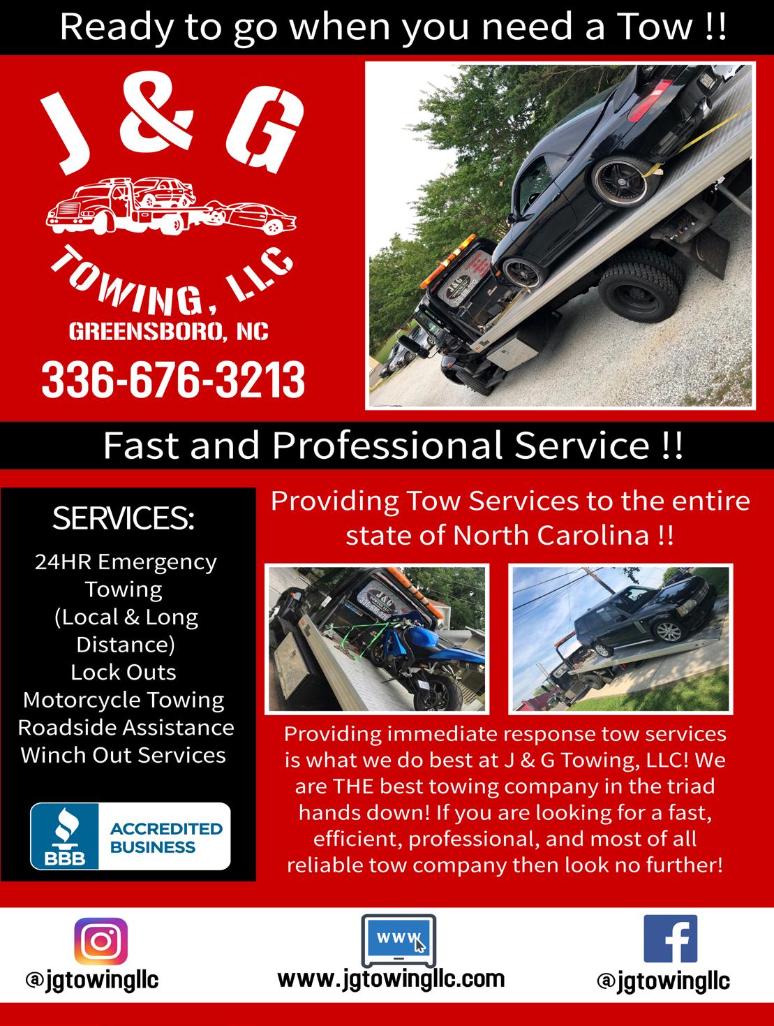 J & G Towing, LLC , is a small family owned towing company based out of Greensboro, NC. They offer some of the best tow services available within the state of North Carolina. These services include 24 Hour Emergency Towing, Lock Outs, Motorcycle Towing, Roadside Assistance, Battery Jumps, Refeuling, Tire Changes, and Winch Out services (up to 150 ft).