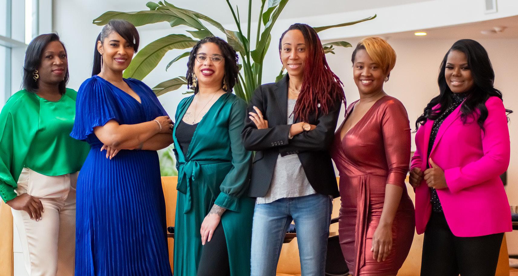 Pictured from left to right are Dr. Ragan Johnson, Co-Investigator, Dr. Schenita Randolph, Director and Principal Investigator, Allison Johnson, Clinical Research Coordinator, Crystal Taylor, Executive Producer for UPDOs, Tamica Campbell Hughes, Community Partner and Stylists, and Corrina Dunn, Community Partner and Stylists. Other members of the HEEAT Lab not pictured include Gene Blackmon, Barber and Owner Prestige Barber College, Akili Hester, Barber and Owner of Black Wall Street Barbershop, Aaron Lyle Jr., CEO Black Fly on the Wall, Dr. Harvey Hinton, Terrance Pleasants, Davon Washington, Dr. Cherie Conley, Dr. Selena Monk, Candice Lewis, and Kelvis Tann.