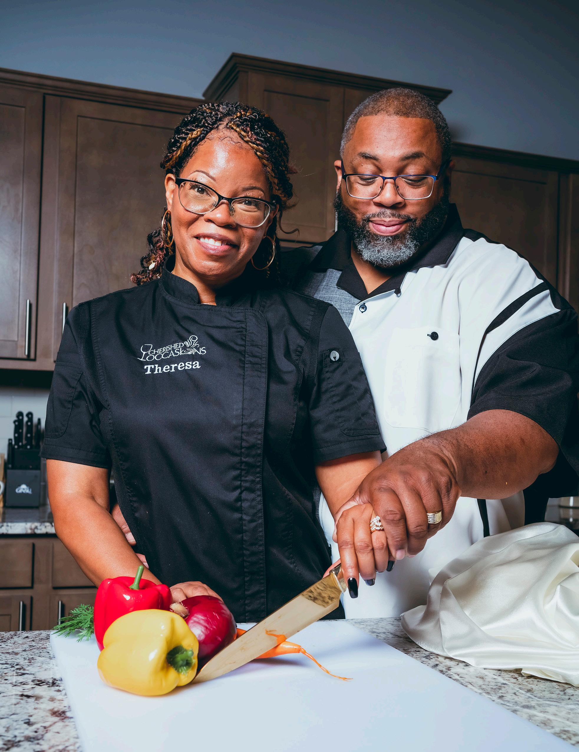 Another thing that makes Cherished Occasions stand out is their ability to prepare nutritious Soul Food. Their clients rave about their macaroni and cheese, and their honey butter is made from scratch so when you put it on cornbread, it’s just a party in your mouth. Their roasted and fried chicken is often a big request, along with mashed potatoes and green beans. They’ve also added a delicious vegetable medley to their menu. “We’re tickled when people who don’t eat vegetables compliment us on that dish,” Theresa says. They also have infused water for people who don’t like drinking water. Their desserts are very good as well. “The way we make our peach and apple cobblers with a caramel shot takes those desserts to the next level.”