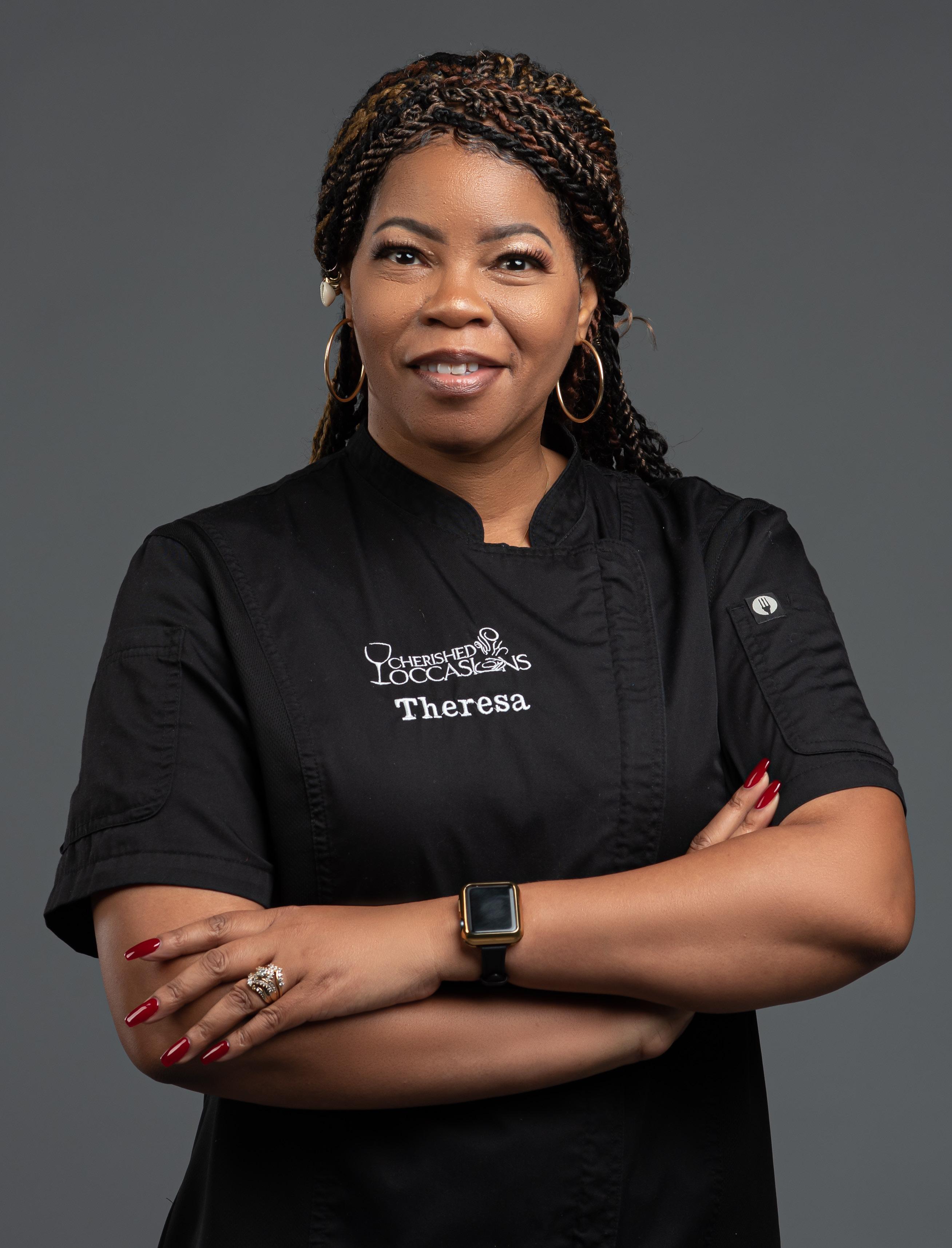 “I have been cooking for a very long time, especially since I am the mother of four children. I had to cook because it was too expensive to go out to eat, so cooking was something I had to do. Everyone from my grandparents, my dad, and my mom cooked, so I was fortunate to learn how to prepare good food from scratch. When my children were younger, they would bring friends home to eat, and they would always show up around dinner time. We were always asked to bring extra dishes during the holidays, I thought because I had a larger family, but that wasn’t the case. I noticed that every time we brought a dish, they were the first to go. It didn’t matter what type either. It could be my homemade yeast rolls with honey butter or one of my baked goods; it didn’t matter. Then someone asked if I would cook for their event. I was hesitant at first, but then I realized if I could cook enough for my children and the neighborhood kids, all I had to do was think of the event as though I was cooking for a large family. I was already doing it without realizing it. From that one event where I had cooked for 20 people soon turned to 50 people, and the next one turned into 100 people, and the rest is history,” Theresa shares.