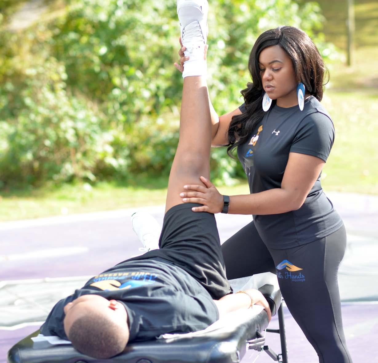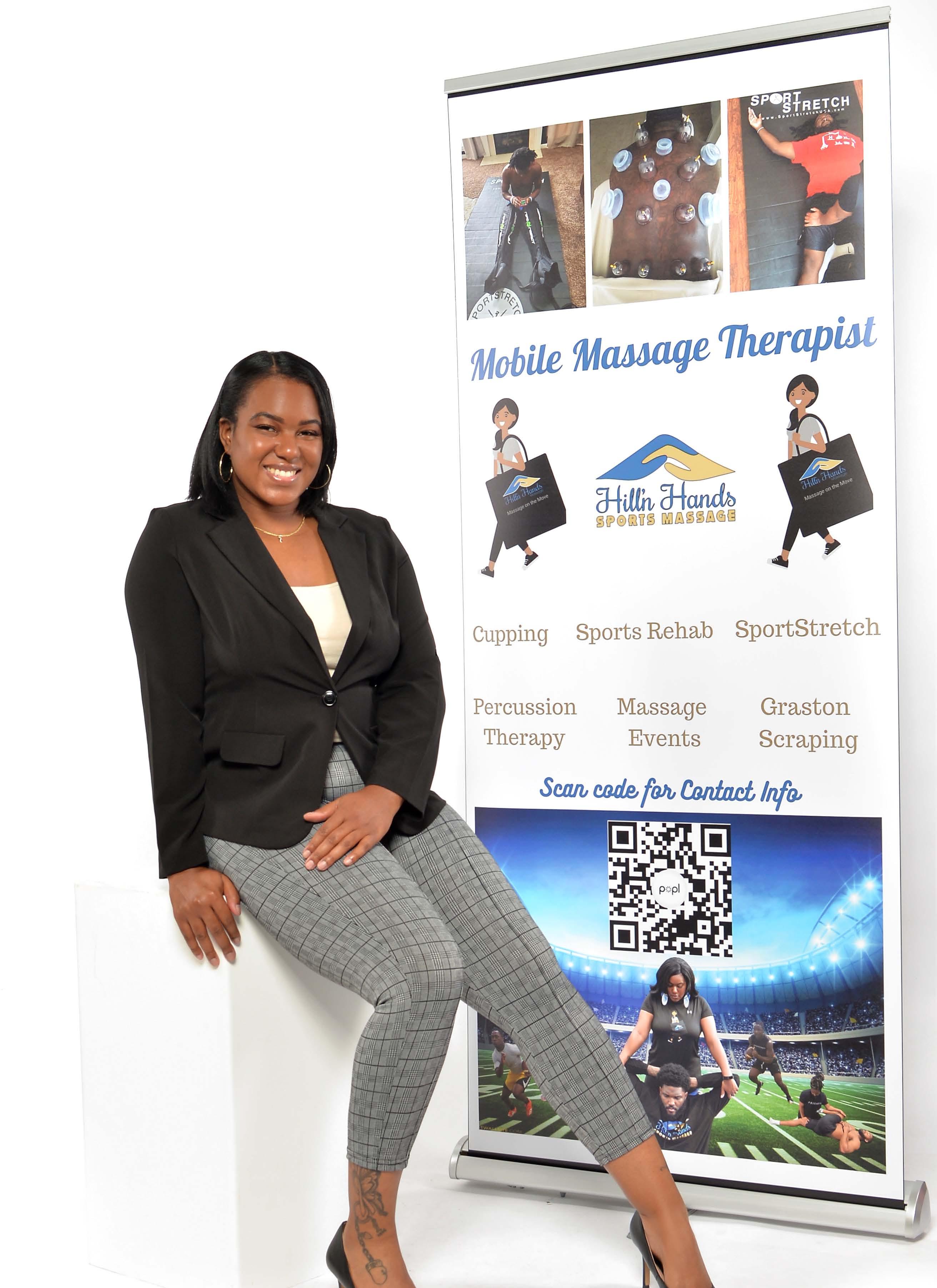 Some of the services offered by Hill’n Hands are sports stretch and massage, and chair massage, which typically involves massaging the neck, shoulders, back, arms, and hands and cupping. Additionally, she provides sports massage services for amateur and professional athletes throughout Charlotte, having some players for the Carolina Panthers as clients.