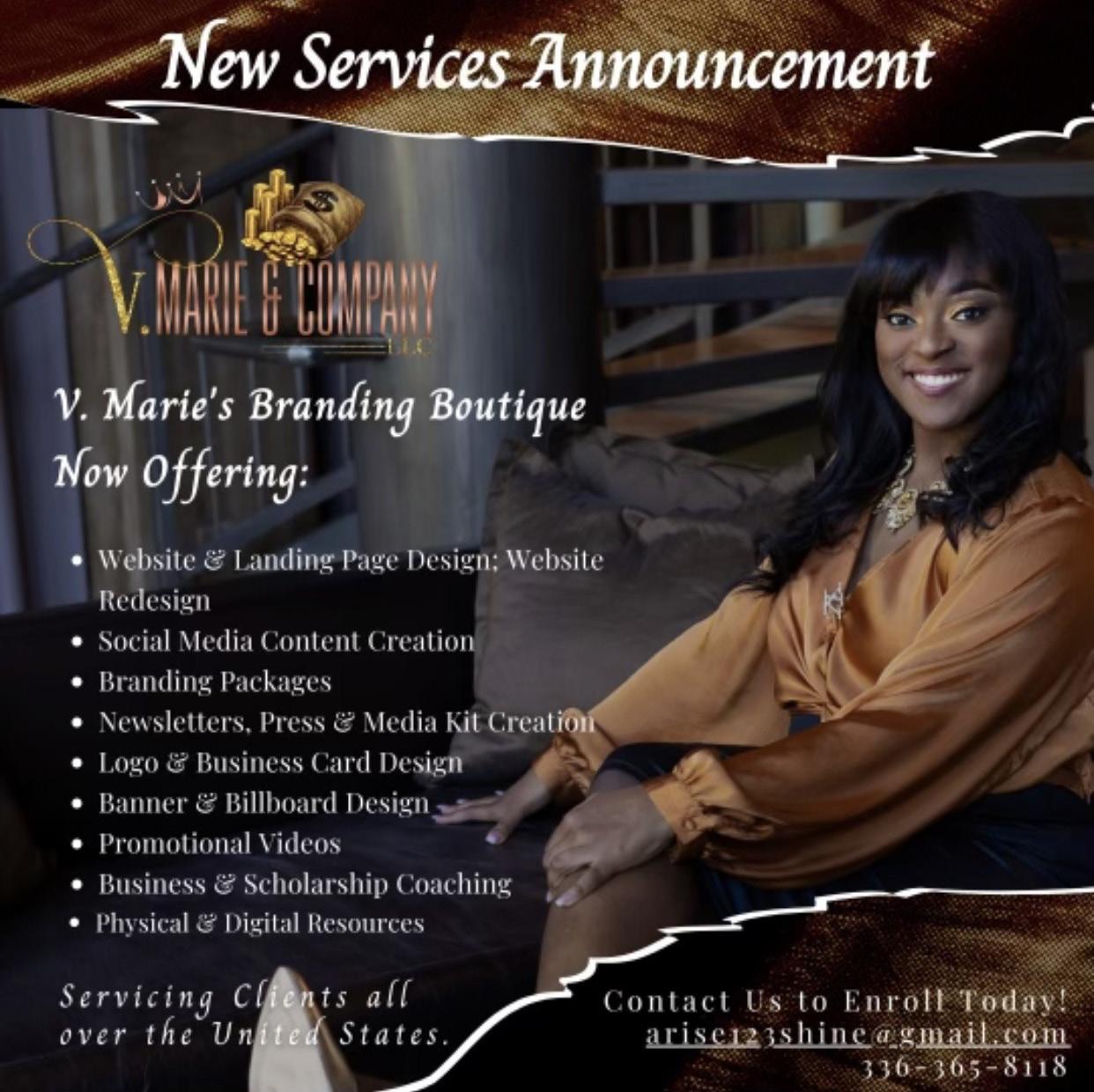 With V. Marie and Company, LLC, she offers Website and Landing Page Design, Website Redesign, Logo and Business Card Design, Banner and Billboard Design, Promotional Videos, Social Media Content Creation, Newsletters, Press and Media Kit Creation, Branding Packages, Business and Scholarship Coaching as well as Physical and Digital Resources.