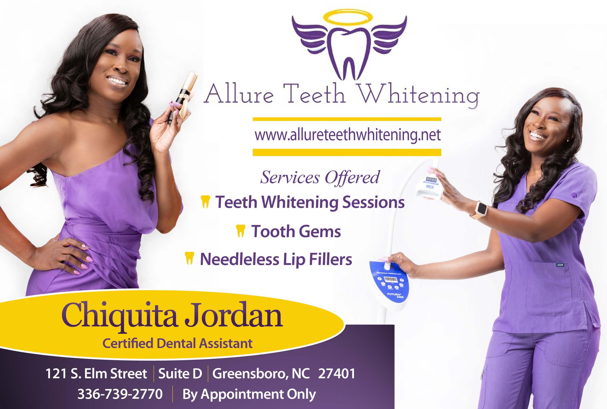 In 2019, Chiquita Jordan decided to open her own business, Allure Teeth Whitening in Greensboro, NC. She offers 30 to 60-minute teeth whitening sessions and also installs tooth gems for clients who want to add a little bling to their smile. As a part of her services, she offers lip fillers, a newer service in her toolbox that is gaining popularity.