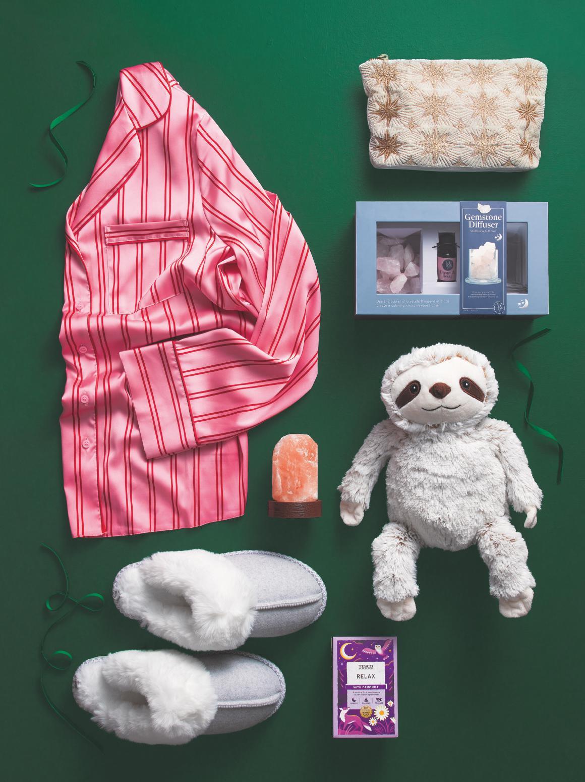 Clockwise from top right Chilli Sauce Selection, £12; World’s Smallest Vacuum, £5; F&F Cashmere Hat & Scarf, £15; Key Finder, £5; The Delicious Deli Tasting Selection, £10; Blue Sky Penguin Handwarmers, £3; F&F Home Wash Bag, £15; Paperchase Ultimate Bucket List Journal, £12; Bubble Tea Gift Set, £7