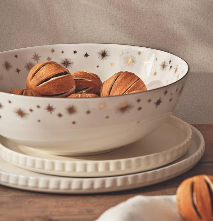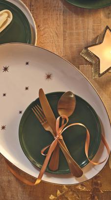 Mix and match crockery in whites, golds and greens for a joyful but modern look. We love the simple star detail on these platters, bowls and glasses for bringing a hint of Christmas sparkle, enhanced with muted gold touches on cutlery and accessories. Plus, guests will love the understated design of these textured-rimmed plates that’ll fit happily in your home beyond the festive season.
