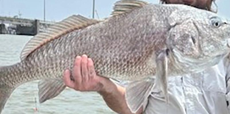 Andy Polk shows off a nice black drum that he caught while fishing near the Pelican Island Bridge in Galveston.