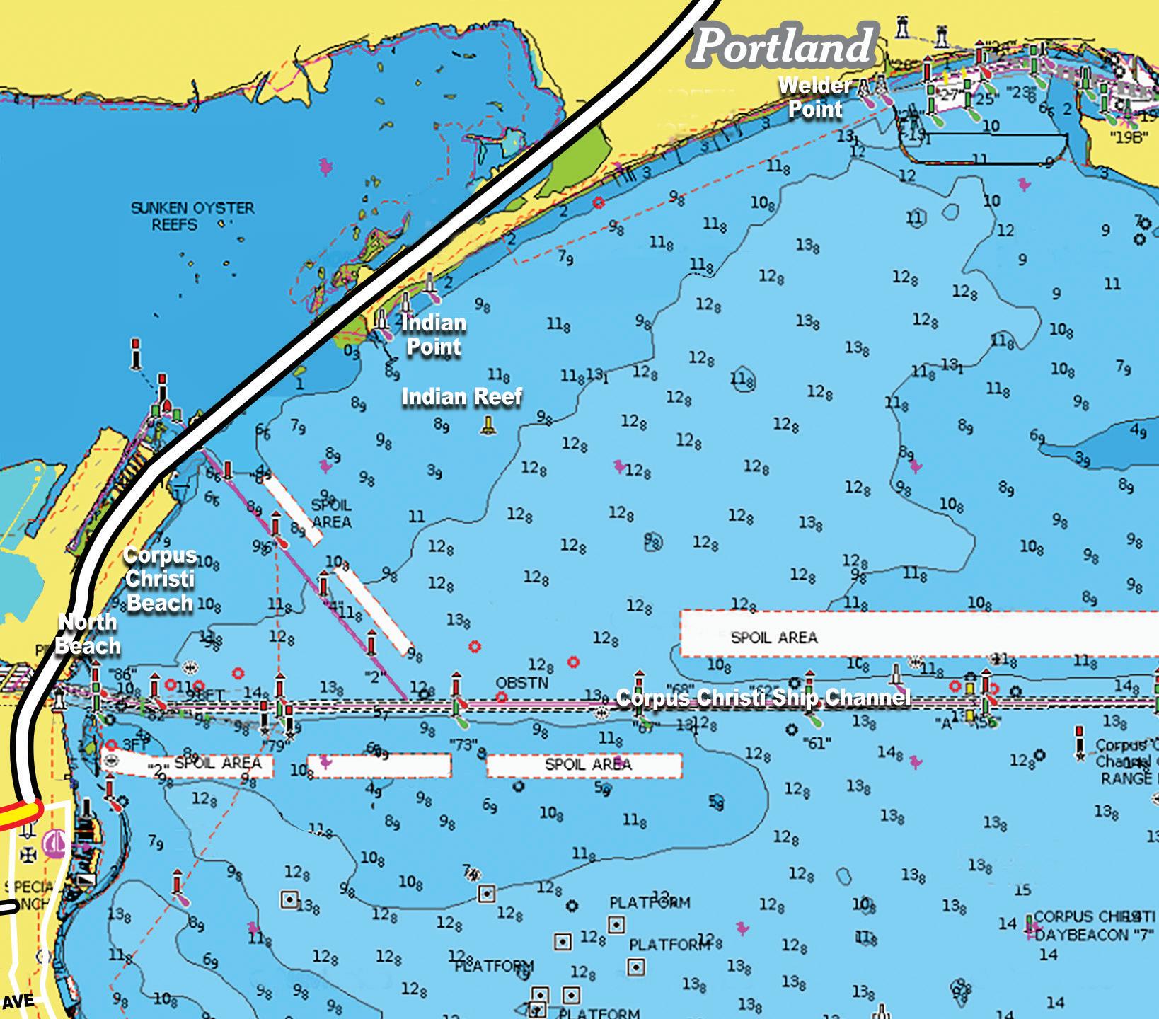 Use the SOLUNAR ADJUSTMENT SCALE on the map below to adjust times for points East and West of our Base Point at Galveston Channel.