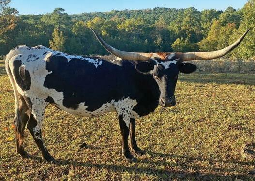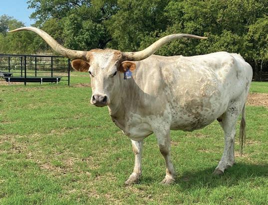 Breeding: Exposed to Silent Iron from 11/1/21 to 1/30/22; Hubbells 20 Gauge from 8/1/22 to 10/30/22. Comments: OCV’d. Miss Melba is a big, thick cow with mid-80’s” rolling horns. Melba is a good producer and all around good cow. We have a real nice YR Roscoe heifer out of her. Go to hubbelllonghorns.net for more info and check out her progeny.