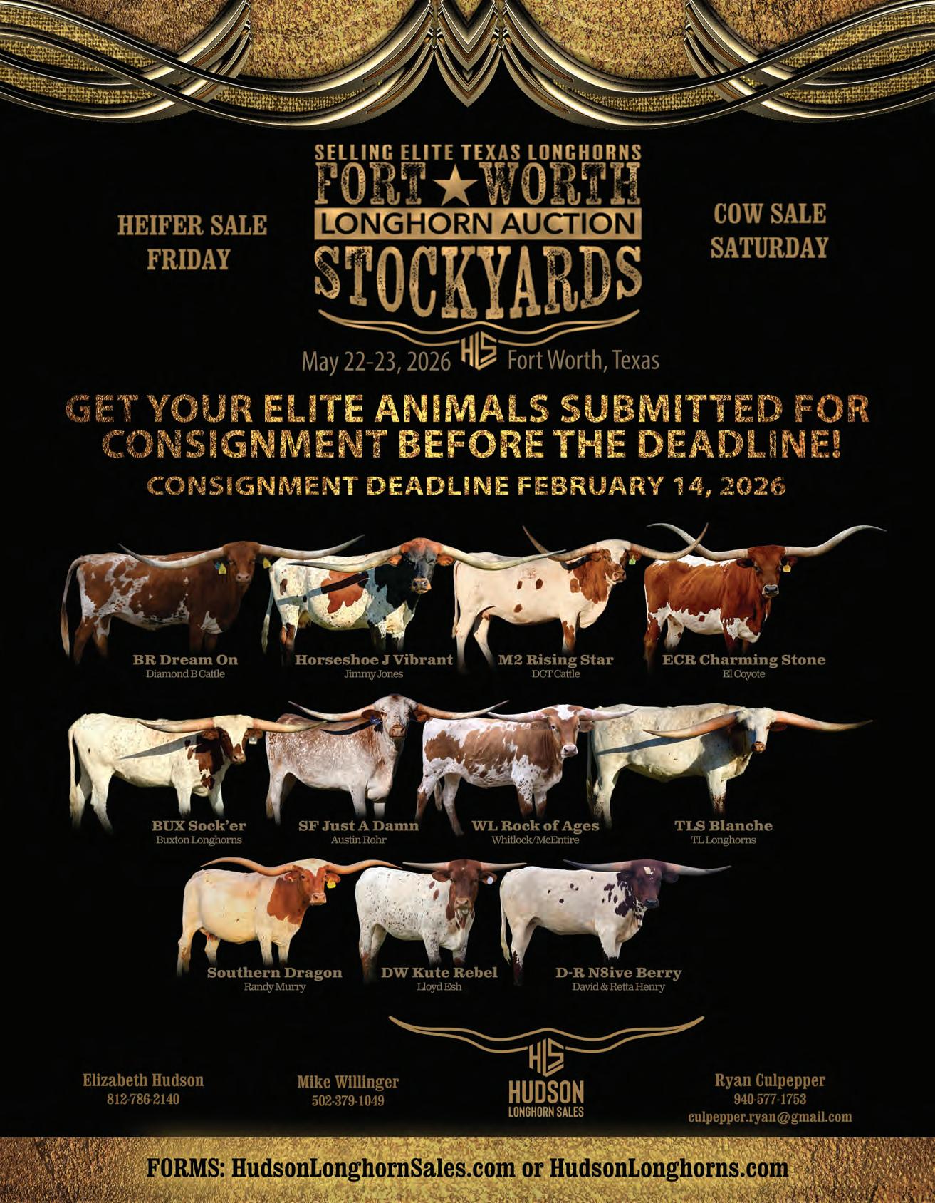May 22-23, 2026 • Fort Worth Stockyards Longhorn Auction, Heifer Sale Friday - Cow Sale Saturday. Contact Hudson Longhorn Sales, Elizabeth Hudsonehudson18@gmail.com or (812) 786-2140.