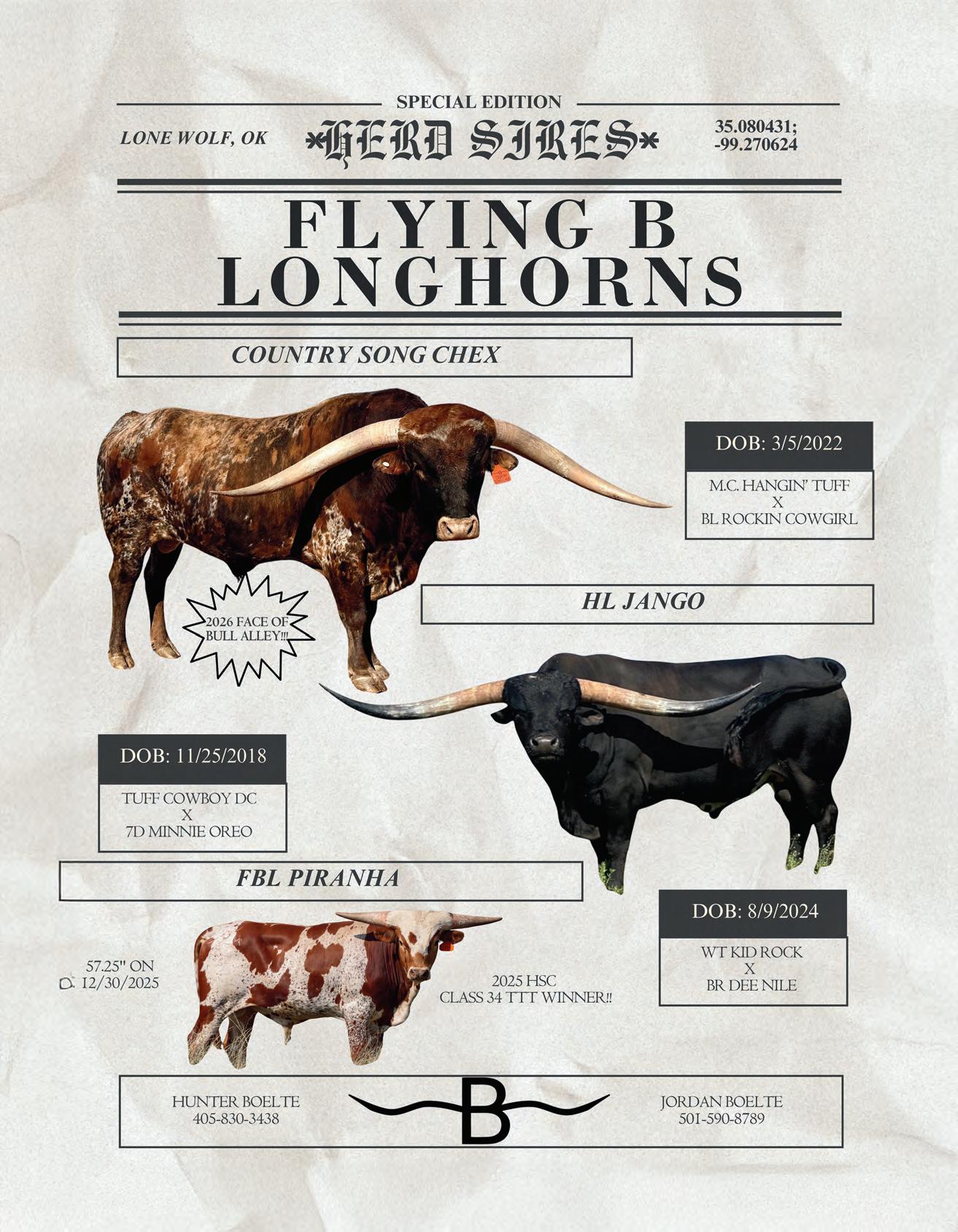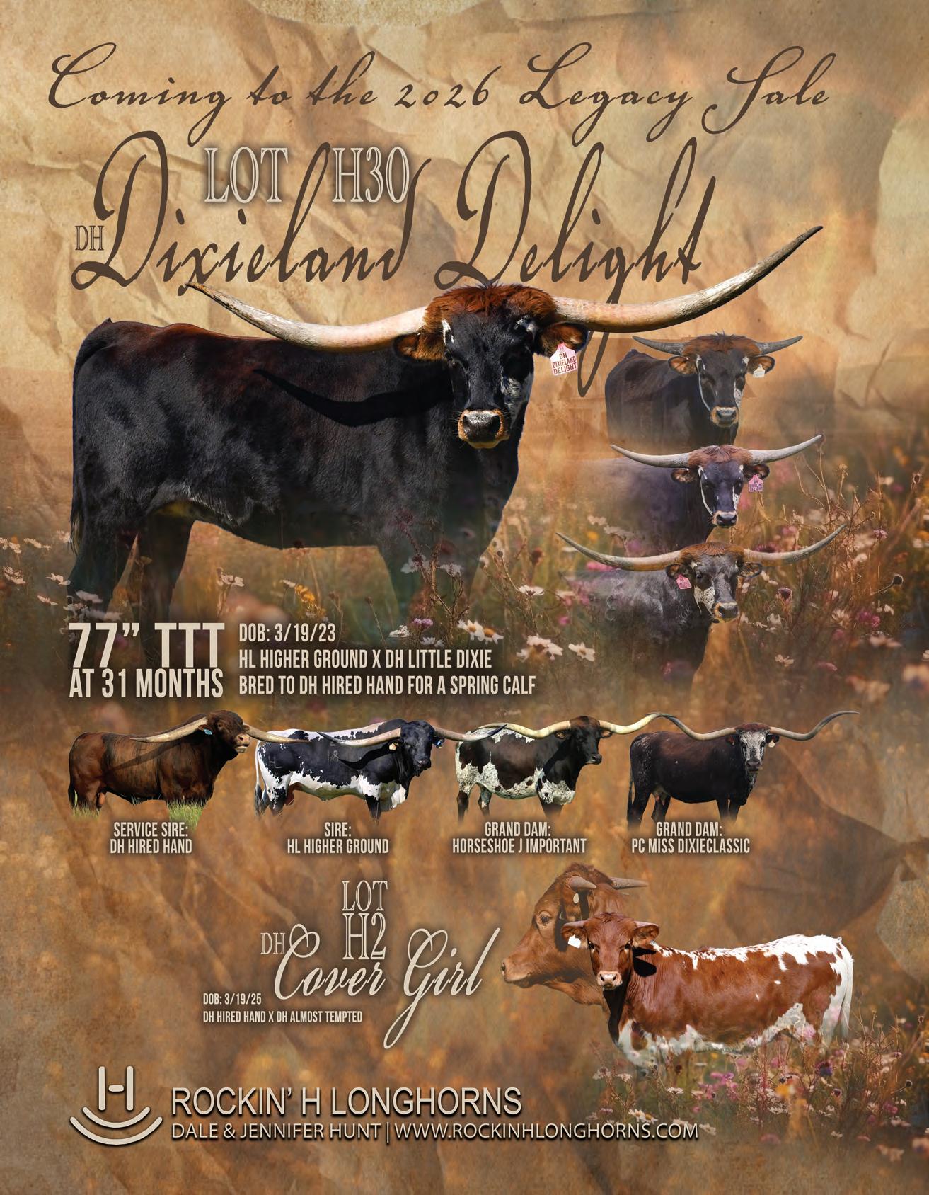 About the Cover: Unmatched genetics Unique down & back twist horn set! 3-100’s in his pedigree. Son of 108”+ DW Fast Stu . 2x Jamakizm, Top Caliber, Drag Iron, Mr Big Stu . His calves are knocking it out of the park with flashy colors and cranked hornsets. Contact a partner today for more information: Tom & Amy Buxton, Buxton Longhorns, www.buxtonlonghorns.com; Wayne & Joanna Manning, M7 Longhorns, www.m7longhorns. com; Lloyd Esh, Dreamwood Farms, www.dreamwoodfarms.com.
