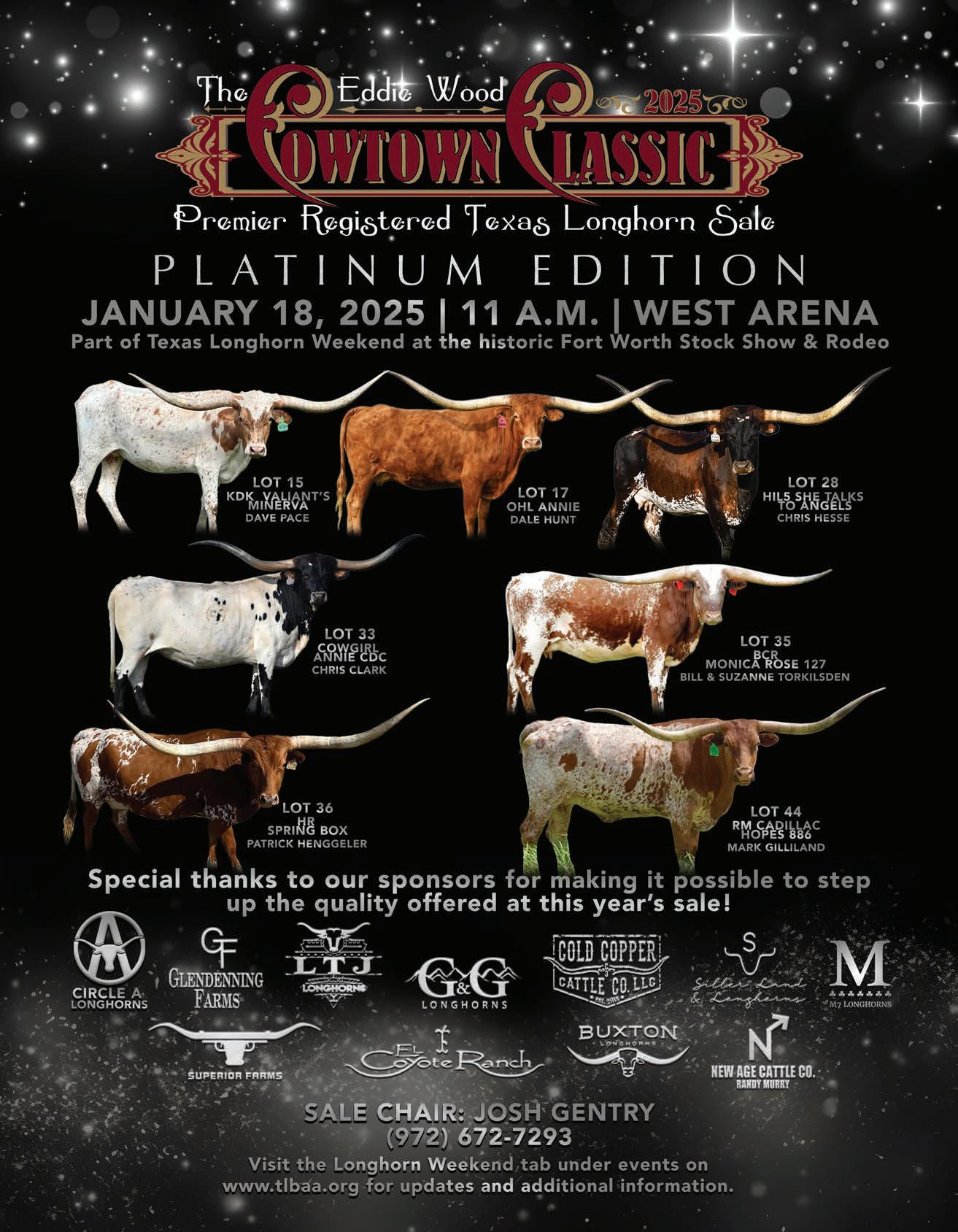 2025 will kick off with a bang at Texas Longhorn Weekend. This year the Eddie Wood Cowtown Classic Platinum Edition has raised the bar thanks to our generous sponsors. The quality of the consignments and the promotion beyond current Longhorn breeders has been stepped up and will make this sale worthy of the historic Fort Worth Stock Show & Rodeo. We hope you will come participate in the meetings, watch the Longhorn shows and take home a new addition to your herd. Bring a friend and let them catch the Longhorn bug as well!