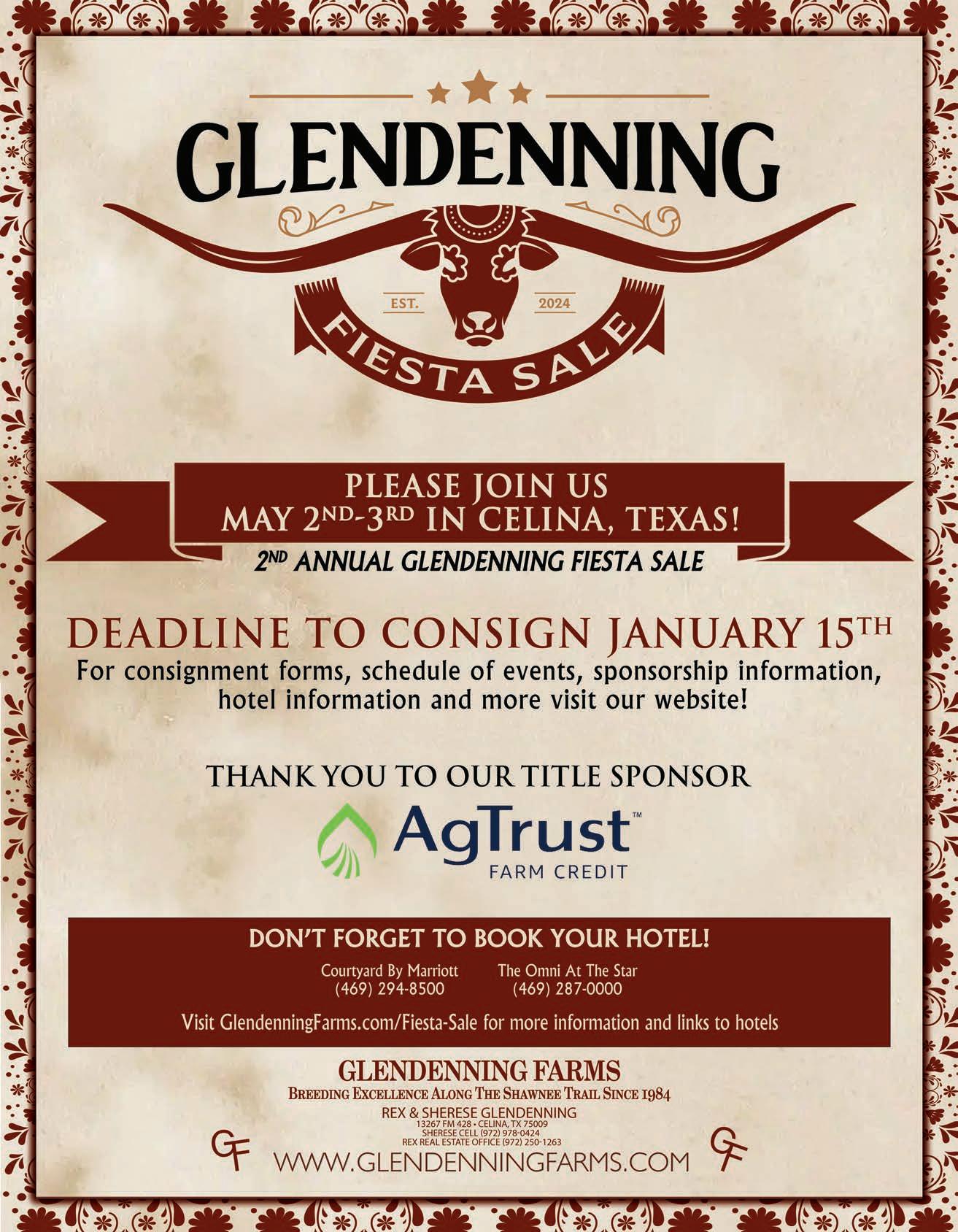May 2-3, 2025 • Glendenning Fiesta Sale, Celina, TX. Celina TX. Contact Sherese Glendenning sherese@glendenningfarms.com 972-978-0424