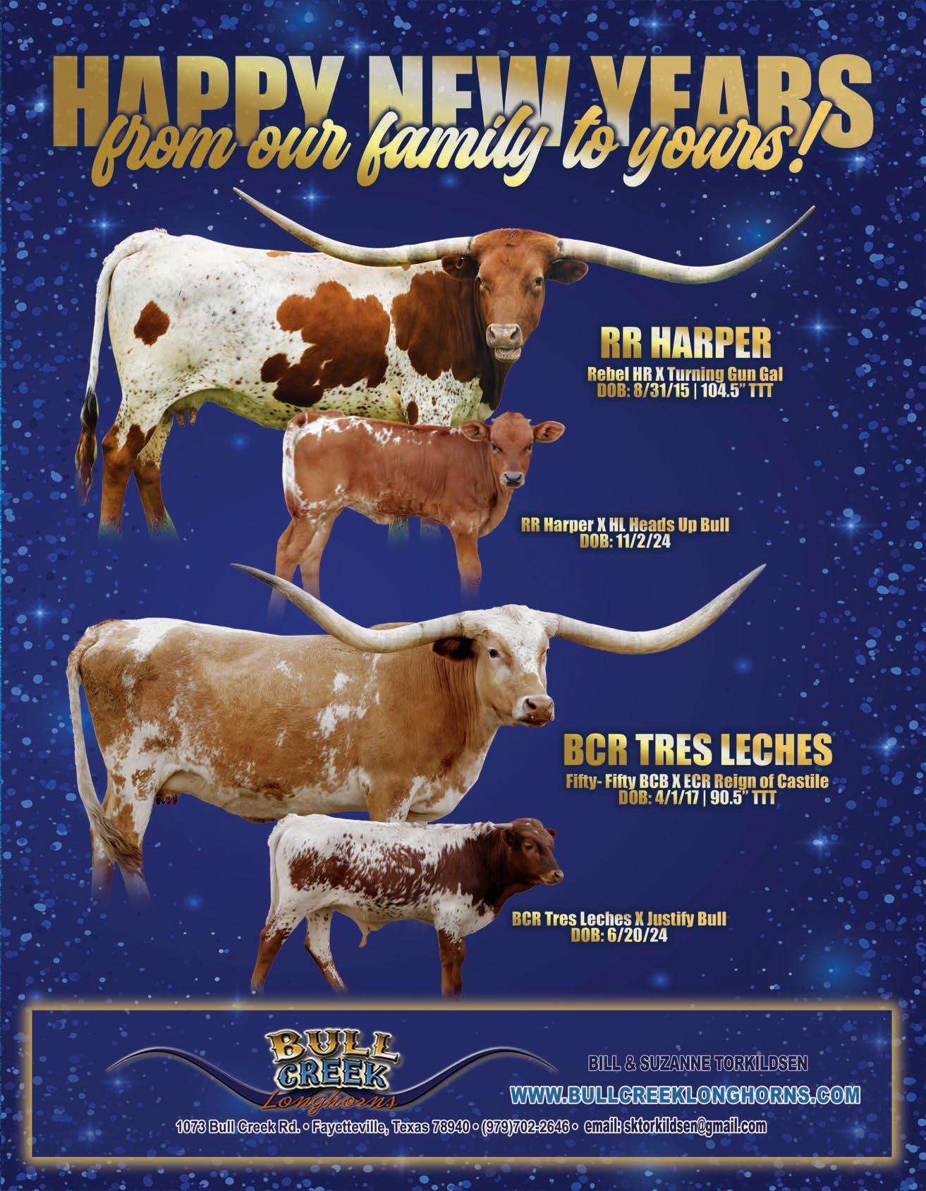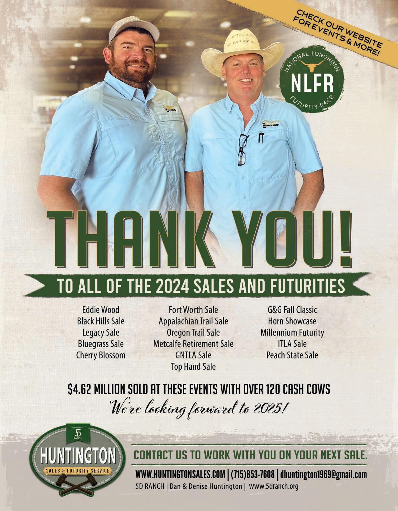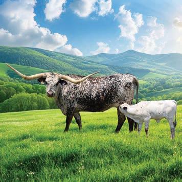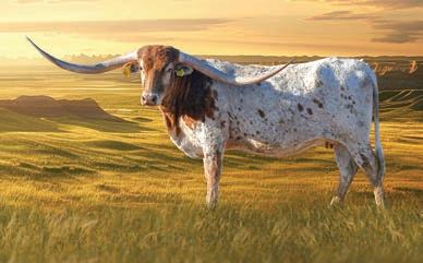 About the Cover: The 2024 National Longhorn Futurity Race (NLFR) is a wrap and the cover showcases the winning female and bull. One Cool Hombre, owned by the Bryant/Manning/Loomis/Buxton Partnership, led the bulls to take home the title.The female leader was Fifty Grande BCC, owned by John & Natalie Chaney. You can find out more about these champions, as well as the leading Sire and Dam of winners and the remaining top 25 heifers and bulls on pages 36-41.