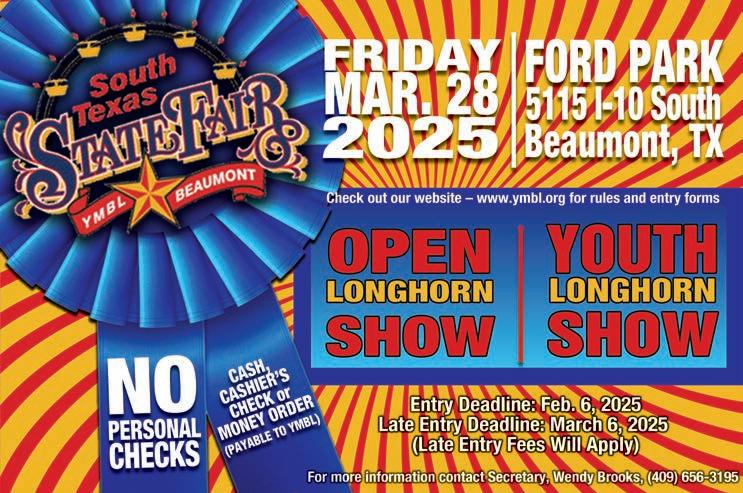 March 21-23, 2025 • OTLA Spring Shootout, Heart of Oklahoma Expo Center, Shawnee, OK. Entry Deadline April 11. Kyla Lovejoy (940) 600-7033 or Kyla_Gail@yahoo.com. Qualifying Haltered, Trophy Steers, Youth, Youth Points Only, Miniatures. March 27-29 • YMBL South Texas State Fair, Ford Park, Beaumont, TX. Bracy Wars (936) 404-2116. Qualifying Haltered, Trophy Steers and Youth. Postmarked Entry Deadline - Feb. 6, 2025 | Postmarked Late Entry Deadline with a fee - March 6, 2025.