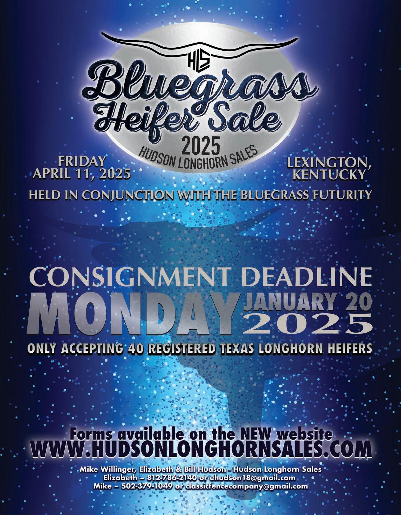 April 11, 2025 • Bluegrass Heifer Sale held in conjunction with the Bluegrass Futurity, Lexington, KY. Sale starts 6 p.m. Contact Hudson Longhorn Sales, Elizabeth Hudsonehudson18@gmail.com or (812) 786-2140.