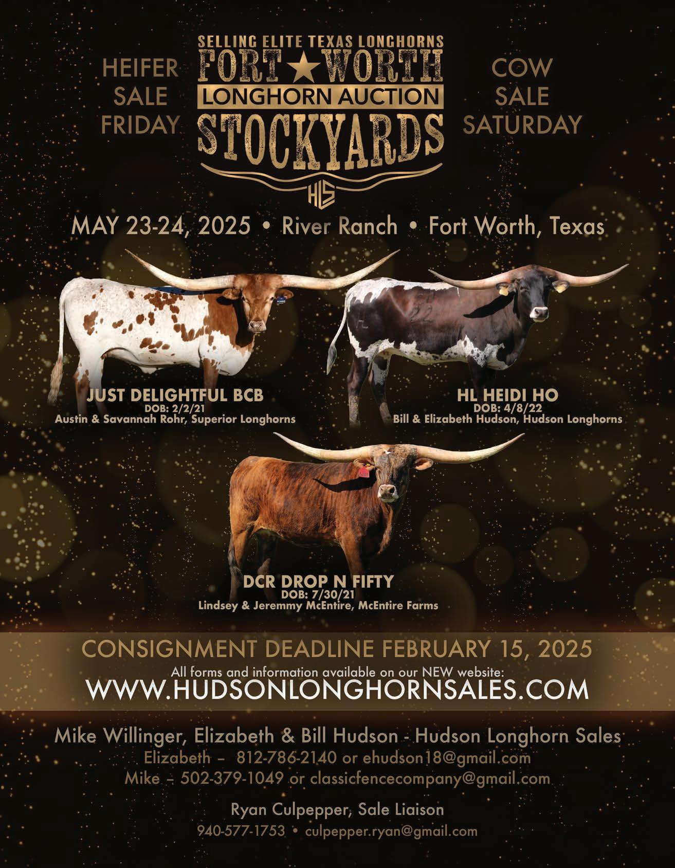 May 23-24, 2025 • Fort Worth Stockyards Longhorn Auction, Heifer Sale Friday - Cow Sale Saturday. Contact Hudson Longhorn Sales, Elizabeth Hudson - ehudson18@gmail.com or (812) 786-2140.