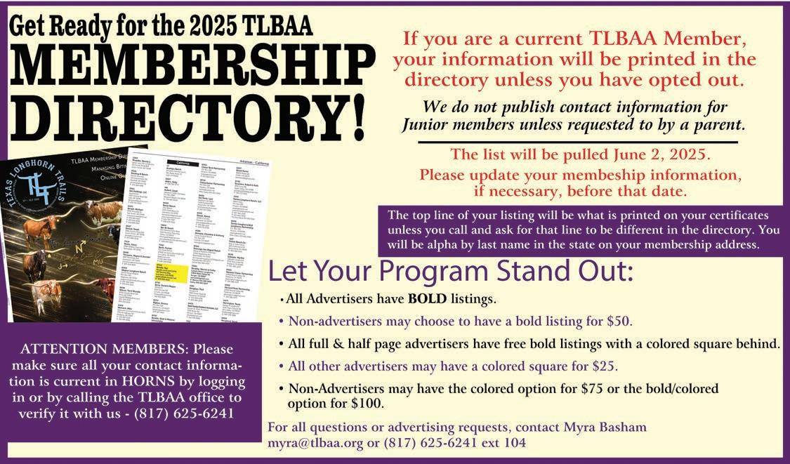 April 11-13, 2025 • 2025 ETLA Corsicana Classic, Navarro County Expo Center, Corsicana, TX Entry Deadline 4/1/25 Contact Debroah Burkham 214-616-2549 dburk5@ hotmail.com Qualifying Haltered, Trophy Steers, Youth, Youth Miniatures, Miniatures April 18-19, 2025 • Cherry Blossom Sale & Futurity, Culpeper Virginia. Chase Vasut 512917-8654; Shawn Pequignot 540-406-3155.