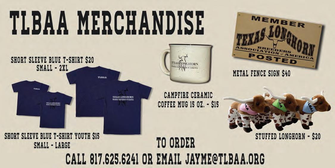 4| March 2023 TEXAS LONGHORN TRAILS FEBRUARY 2023 Vol. 34 • No. 12 2 Board of Directors 6 Editor’s Note 10 Chairman’s Letter 42 TLBT Letter 44 Meet Our Members 44 New Members 45 A liate News 48 Show Results 52 Breeders Guide 55 Index/Just For Grins 56 Calendar COVER STORIES DEPARTMENTS The Texas Longhorn Trails (ISSN-10988432, USPS 016469) is published monthly by the Texas Longhorn Breeders Association of America, 221 W. Exchange, Ste. 210, Fort Worth, TX 76164. Periodical Postage Paid at Fort Worth, TX. Subscription rates: $105 per year; foreign per year $180. POSTMASTER: Send address changes to: Texas Longhorn Trails, 221 W. Exchange, Ste. 210, Fort Worth, TX 76164. Phone (817) 625-6241. Fax (817) 625-1388. Advertisers and advertising agencies assume liability for all content of advertisements printed and also assume responsibility for any claims arising from such advertisements made against the publisher. Publisher reserves exclusive rights to accept or reject advertising or editorial material submitted for publication in the Texas Longhorn Trails magazine. Articles and photos from this publication may be reprinted only with permission of the publisher. About the Cover: The Rodger Damrow Coloful Calf Competition had over 100 entries and the competition was tough! Congratulations to LCR MOONLIGHT BANDIT (Justified x Jubilee Jam EOT) a bull calf owned by Marshall A. Paczosa of Elba, Nebraska. To see all the entries, turn to pgs. 22-29. FEATURES 14 TLBAA Special Awards 34 BEEF: Embrace Your Di erences Your product is not like the beef being sold at big chains. Learn to capitalize on the di erences. By Andrew Shagoury 12-32 2023 Texas Longhorn Weekend 36 New Breeders Corner: Basics For New Breeders By David “Nik” Nikodym 38 HERD HEALTH: Assisting The Bonding Process Between Cow And Calf Sometimes a cow just needs a little encouragement to accept her calf. Ways to do it and keep everyone safe, By Heather Smith Thomas 40 SHOWS: Cattlemen’s Congress 18 TLBAA Hall of Fame 22 2022 Rodger Damrow Colorful Calf Contest 30 Fort Worth Stock Show Results 32 Eddie Wood Cowtown Classic Sale Results 37 Ask The Vet: What Does “OCV” Mean? By Julie Pack, DVM