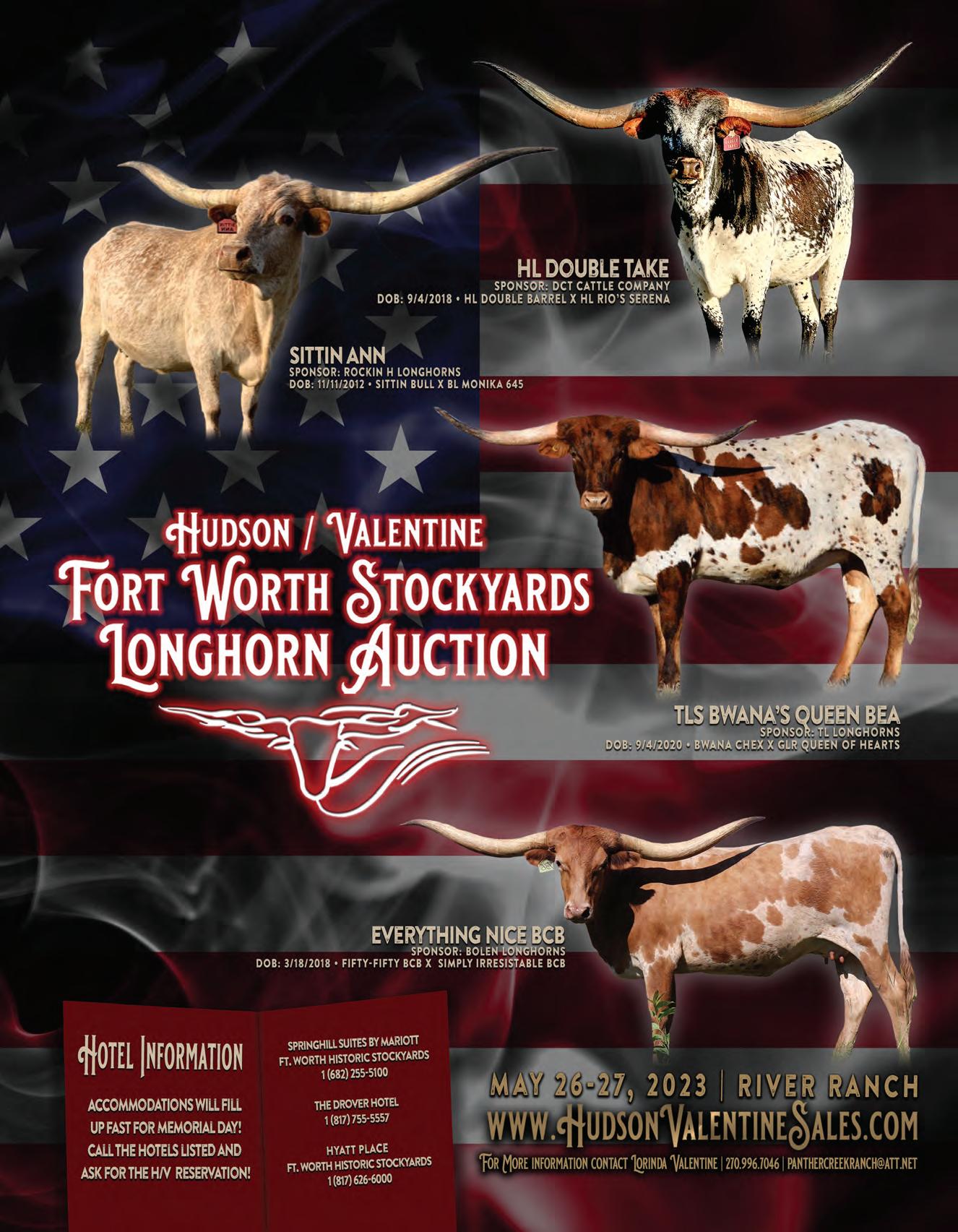 May 26-27 • Hudson-Valentine Fort Worth Stockyards Longhorn Auction, River Ranch Stockyards. Lorinda Valentine (270) 996-2046 or panthercreekranch@att.net