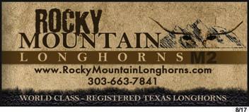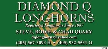 BEAVER CREEK LONGHORNS - Est. 1995. Conformation, color, disposition, pedigree and HORNS. Reasonable prices. Carole Muchmore, Ponca City, OK. 580 765-9961 (calls only) or email cmuchmor@ poncacity.net. www.beavercreeklonghorns.com