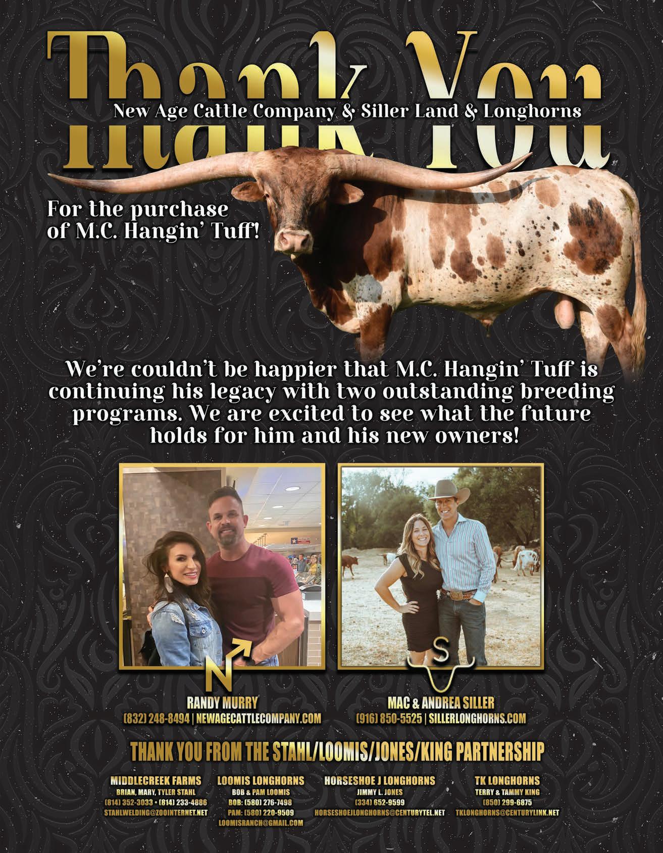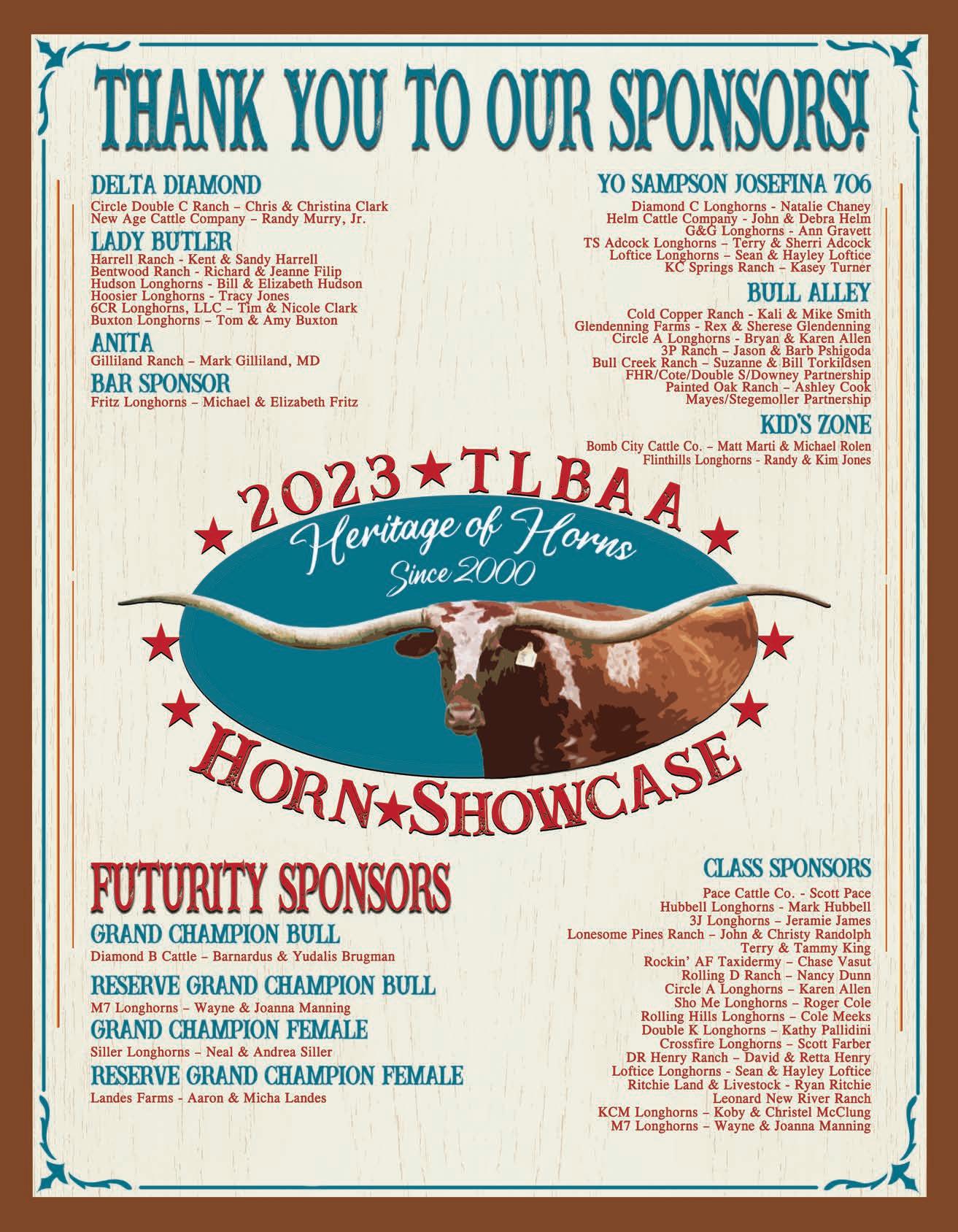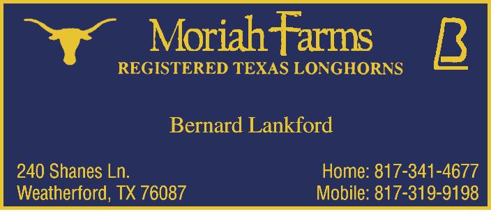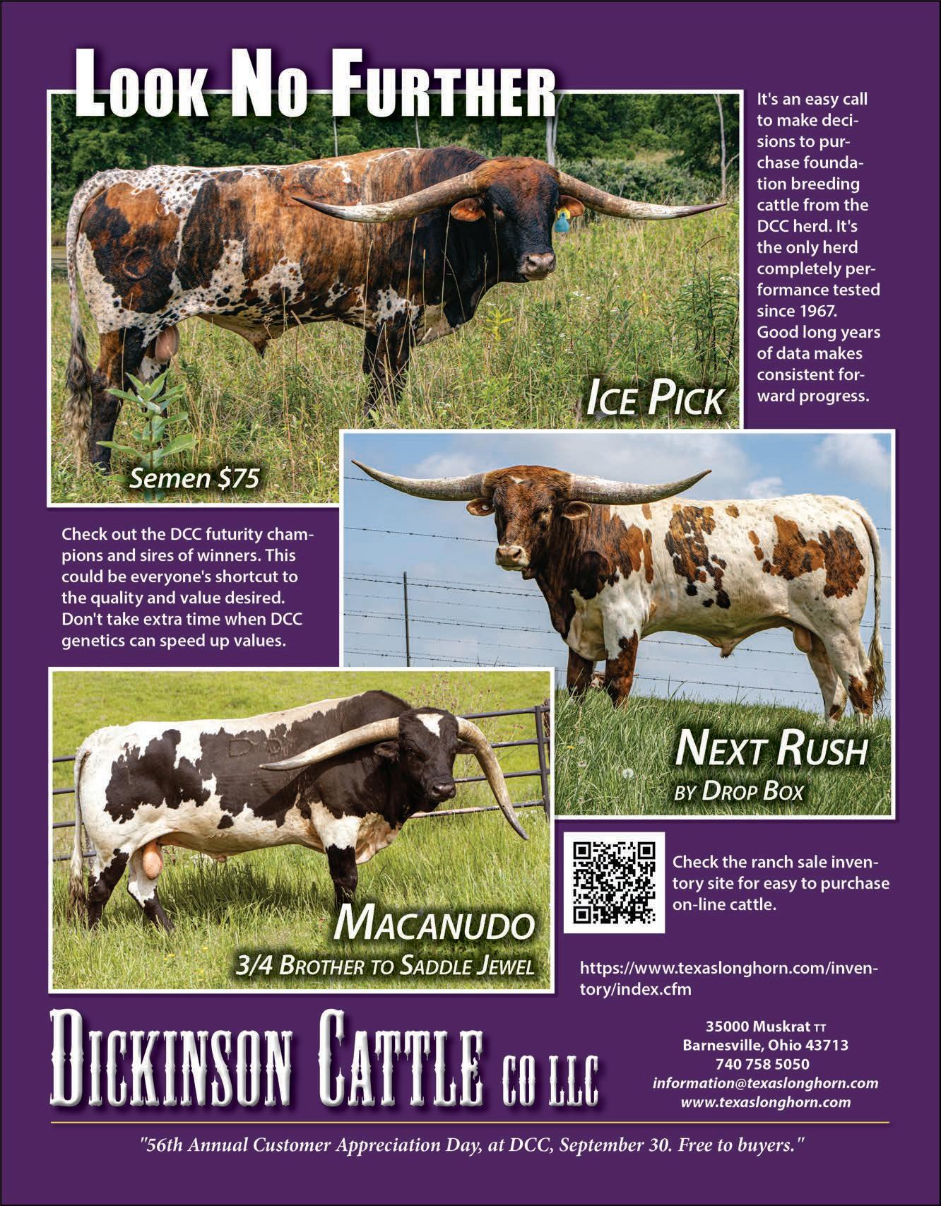 TEXAS LONGHORN TRAILS September 2023 | 55 — A — A & S Land & Cattle 53 Anderson, Frank Jr. and III 8 Arch Acres 52 — B — Baker, Bo 8 Bar H Ranch 52 Beadle Land & Cattle 8, 52 Bennett Longhorn Cattle Co. 8 Bentwood Ranch 54 Big Valley Longhorns 52 BPT Longhorns 8 Bull Creek Longhorns 7 Butler Breeders 8, 9 Butler Breeder’s Futurity 9 Buxton Longhorns 27, 37, 54 — C — C4Longhorns 8 Caballo Bravo Longhorns 52 Cedar View Ranch 52 Christa Cattle Co. 8 C Lazy S Bar Cattle Co. 53 Cold Copper Cattle Co.. 29, 39 Colorful Calf. 14 Cote Cattle Company 52 Cowboy Conversations IBC Crazy Cattle Co 53 Cross Fire Longhorns 52 — D — Dalgood Longhorns 8 DCCI Equipment 51 Diamond C Ranch 53 Diamond Q Longhorns 53 Dickinson Cattle Co BC — E — Eddie Wood Sale 30-31 El Coyote Ranch 1 Elm Springs Acres 54 — F — F & F Ranch 52 Falls Creek Longhorns 8 FHR Longhorns 53 Flying Diamond Ranch 52 — G — Glendenning Farms 12, 13, 54 GVR Longhorns FC, 53 — H — Helm Cattle Co 53 Hicks Texas Longhorns 8 Hickman Longhorns 53 Hired Hand Live 34 Hired Hand Software 50 Horn Showcase 15-21 Horseshoe J Longhorns 25 Hutton 3 Cattle 54 — I — Ironwood Ranch 53 — J — J2 Longhorns. 5 Jack Mountain Ranch 54 Jane’s Land & Cattle Co..............................9 JH Cattle Company 54 J&M Ranch 53 J.M.R. Cattle Co. 53 Jo-Lin Ranch. 54 — L — Lemonade Ranch 53 Little Ace Cattle Co. 9 Llano PBR. 35 Lodge Creek Longhorns 52 Lone Wolf Ranch 53 Longhorn Opportunities IFC Longhorn Ventures 52 Loomis Ranch 25 Lucky Mountain Ranch 53 Lucas Ranch 52 Lutt Longhorns 53 — M — McCarty, Bruce 58 McLeod Ranch 9 Middlecreek Farms 25 Montgomery Briggs Ranch 52 Moose Willow Ranch 52 Moriah Farms...............................................53 — N — New Age Cattle Company 5 Northbrook Cattle Company 53 NS Horns 52 — O — Oliver Longhorns 53 — R — Raising Hale Ranch 53 Rio Vista Ranch 9 River’s Bend Ranch 53 Robert King 54 Rockin’ D Longhorns 3 Rockin’ Hil Ranch 52 Rockin’ M Ranch 11, 45 Rocking P Longhorns 8,9 Rocky Mountain Longhorns.....................52 Rolling D Ranch 52 Rolling Hills Ranch Longhorns 52 Roper’s Ranch 54 Ross Ranch Horns 53 — S — Safari B Ranch 53 Sand Hills Ranch 52 Siller Land & Cattle 5, 52 Singing Coyote Ranch...............................54 Spidle Ranch 54 Spring Creek Farms 9 SS Longhorns 53 Star Creek Ranch 54 Struthoff Ranch 54 Sutton Timber & Cattle 52 — T — Thate Cattle Co 9 TK Longhorns 25 Thurmond Longhorns 54 TLBT 49 Triple R Ranch (TX) 9 Triple S Bar Ranch 33, 53 TS Adcock Longhorns 54 — W — Walkers U7- 54 WB Longhorns 53 Westhaven Longhorns 52 Wynfaul Acres 9 UPCOMING ISSUES: October: Beef Edition November: Equipment/Facilities December: Horn Showcase Wrap-Up Advertising index JUST FOR GRINS HAVE A CUTE PIC? Send us your photo with a funny caption included! Send your photo with caption to: Texas Longhorn Trails, Attn. Myra, • P.O. Box 4430 • Fort Worth, Texas 44160 or myra@tlbaa.org (Email entries should include address.) Photo may be used
