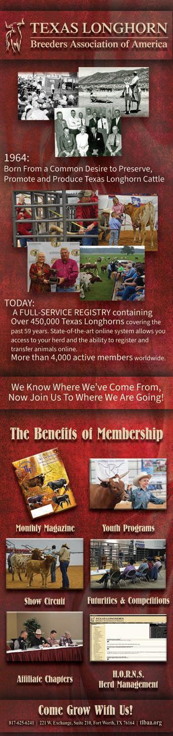 No matter whether you are simply curious about Longhorns or a seasoned breeder, there are plenty of upcoming events to gather with other Longhorn breeders to fellowship and learn. The TLBAA’s next major event is the Horn Showcase. It has something for everyone. Horn measuring, futurity competition, a select sale and educational seminars. Turn to page 18 to read more about this event.