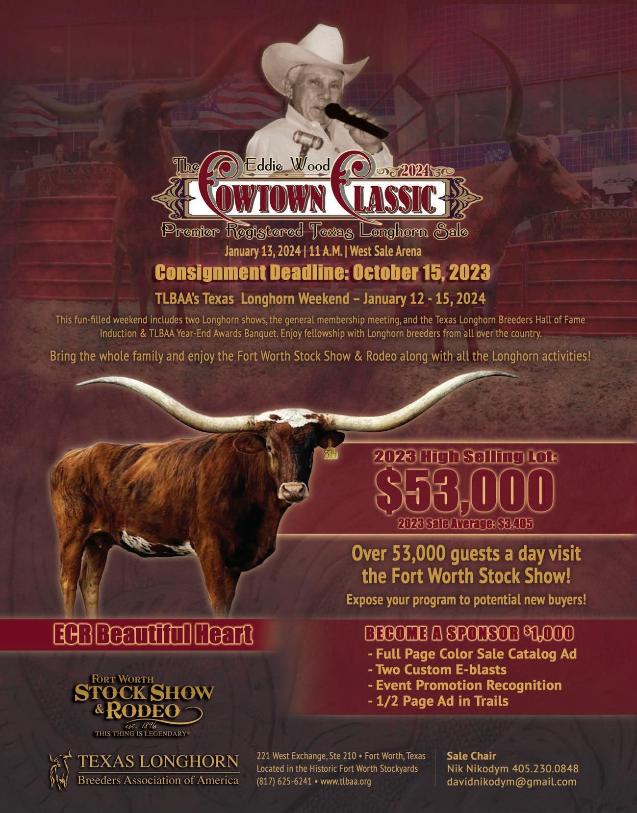 If you missed out on consigning to the Horn Showcase Select Sale, the Eddie Wood Cowtown Classic Sale is now accepting consignments. It’s a great sale to be in, benefiting from the exposure to tons of potential new Longhorn buyers at the Fort Worth Stock Show and Rodeo. You can find more information on pgs. 30-31.