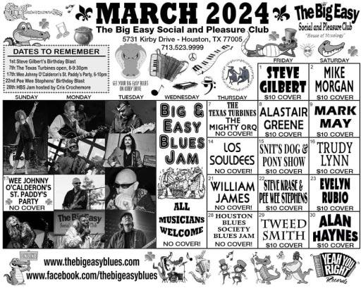 2 Music News • March 2024 Special Events at The 19th Hole Tuesdays Karaoke Wednesdays Bingo Fridays 10 oz. Steak Lunch Special Only $13.99 Every Thursday Night Live Jam Session! All Musicians Welcome! GRILL & SPORTS BAR 202 Sawdust Rd. (The Woodlands) • 281-363-2574 • http://www.19th.cc The 19th Hole Grill & Bar is celebrating our 32nd Year Anniversary of being a live music venue DART TOURNAMENT EVERY MONDAY NIGHT!! Take I-45 to the Rayford/Sawdust exit in Spring • Go west on Rayford/Sawdust • Make a right turn at the first red light We’re at the end of the strip center on your left! @ 8:00 PM https://www.facebook.com/theHOLE19TH/ March 2024