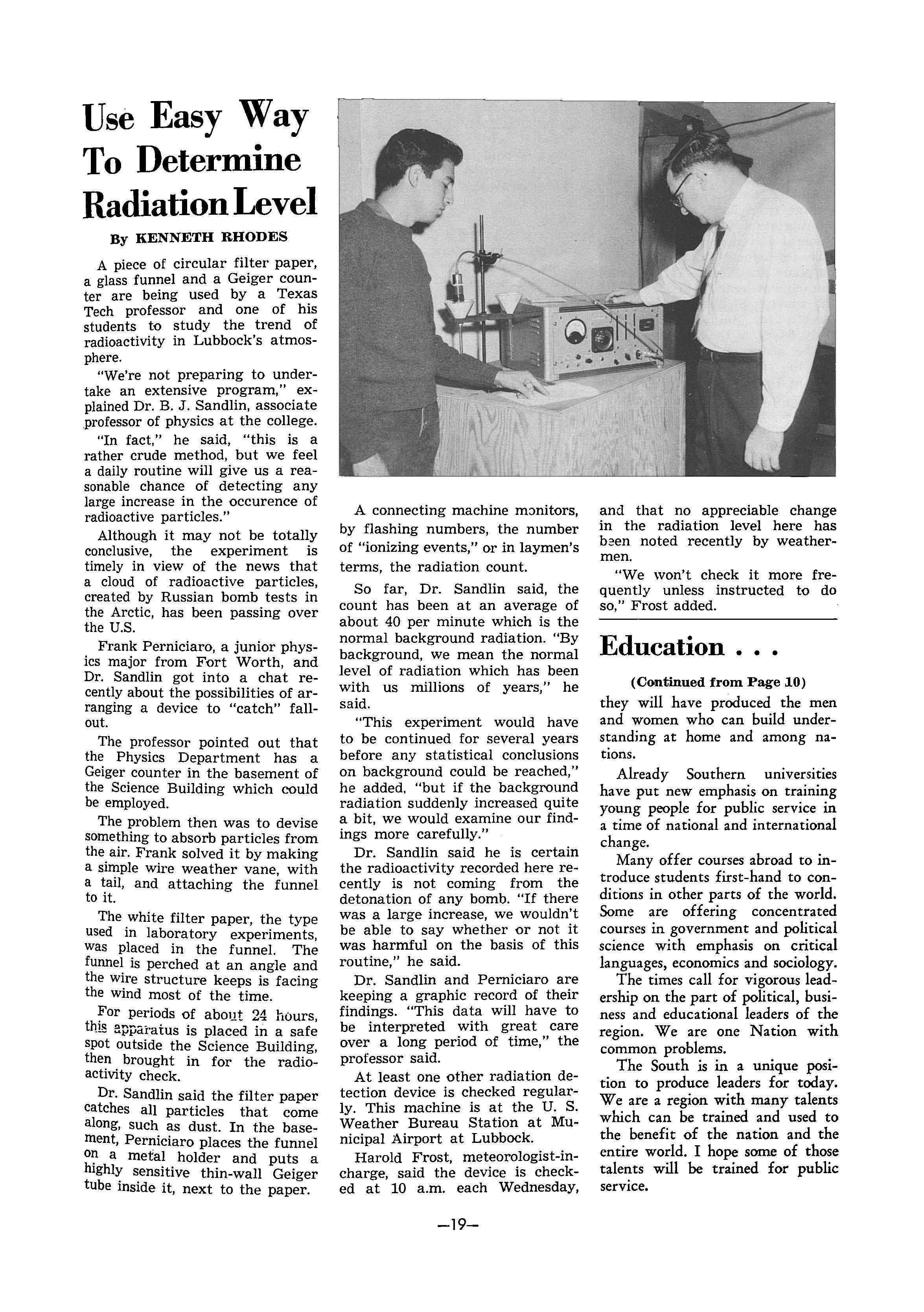 Dr. Sandlin said he is certain the radioactivity recorded here recently is not coming from the detonation of any bomb. "If there was a large increase, we wouldn't be able to say whether or not it was harmful on the basis of this routine," he said.
