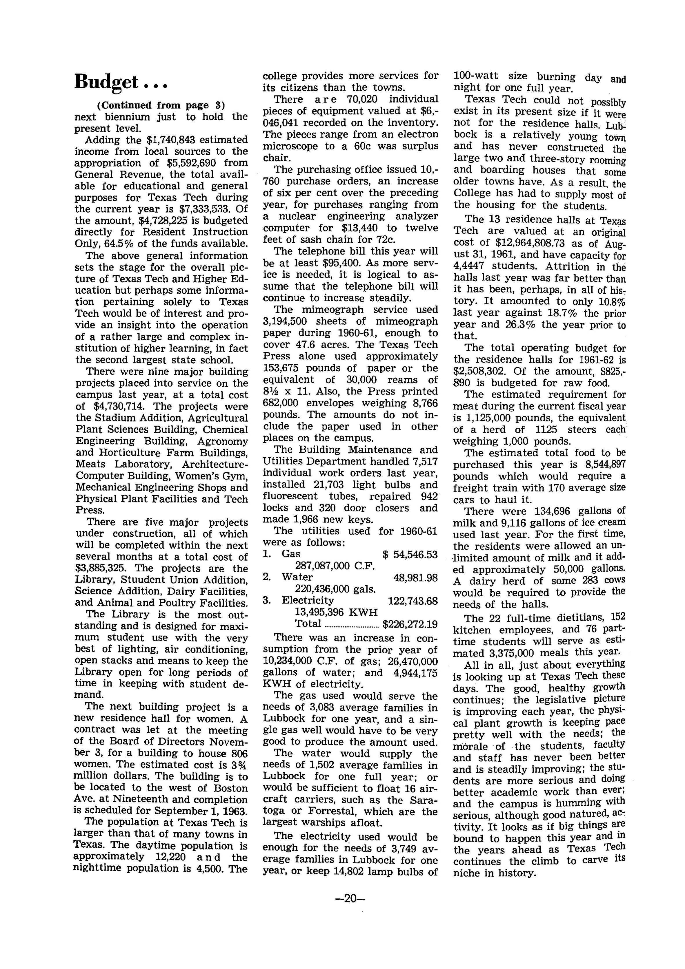 Excluding Building Funds and Agency Funds, the original operating budget for 1960-61 was $10,531.982. For 1961-62 the original oper-ating budget is $12,122,220, an increase of $1.580.237 over the pre· ceding year. In addition, to the educational and general funds, all auxiliary enterprise funds are budgett•d, such as dormitories, bookstore. student union. athletics, Tech press. and others