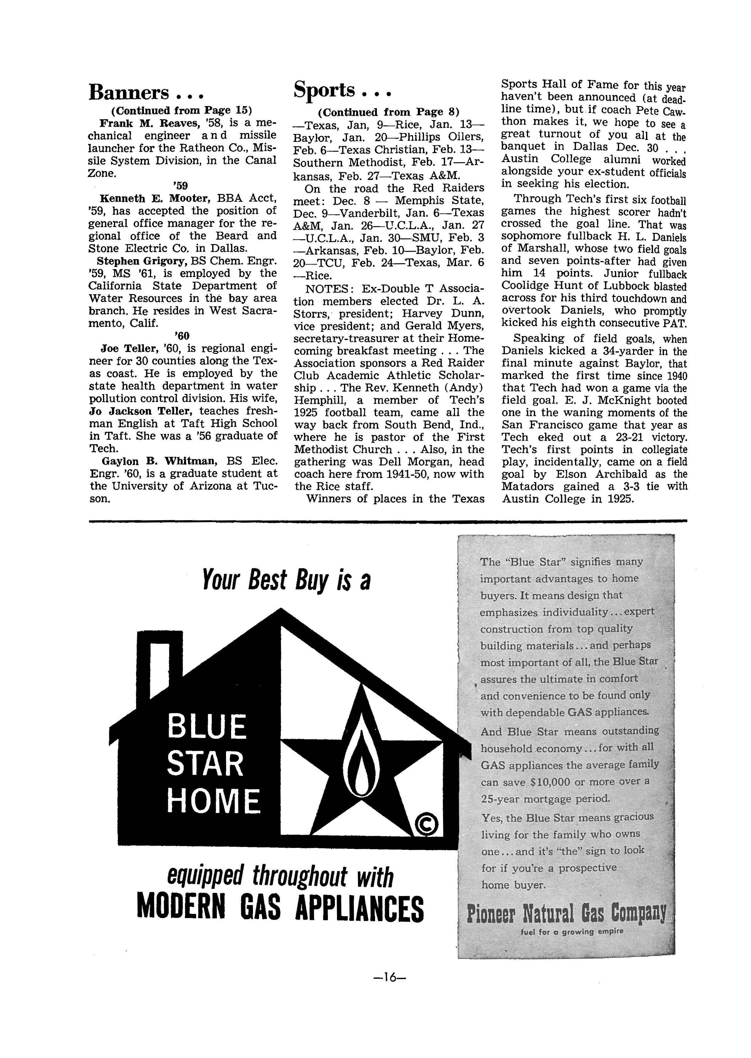 Exes continuously say that the Homecoming Luncheon is one of the finest events on the program each year. This year was no exception. More exes were gathered at one time during the luncheon this year than at any otht'r e\·ent on the program. This year's luncheon contributed much to the success of Homecoming. For their outstanding cont r·ibutions, I would like to express our sincere appreciation to Furr Foods. Inc., Dunlap's Department Stores, and Frontier Stamps.