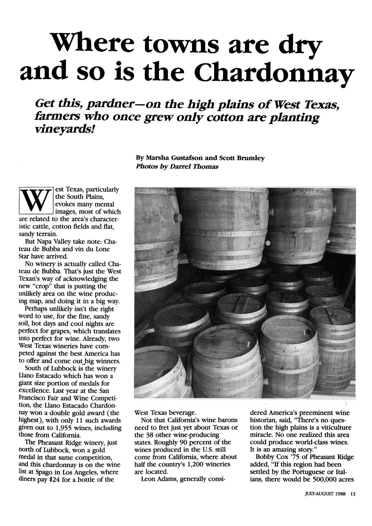 Where towns are dry and so is the Chardonnay 13 The high plains of West Texas are producing some award-winning wines
