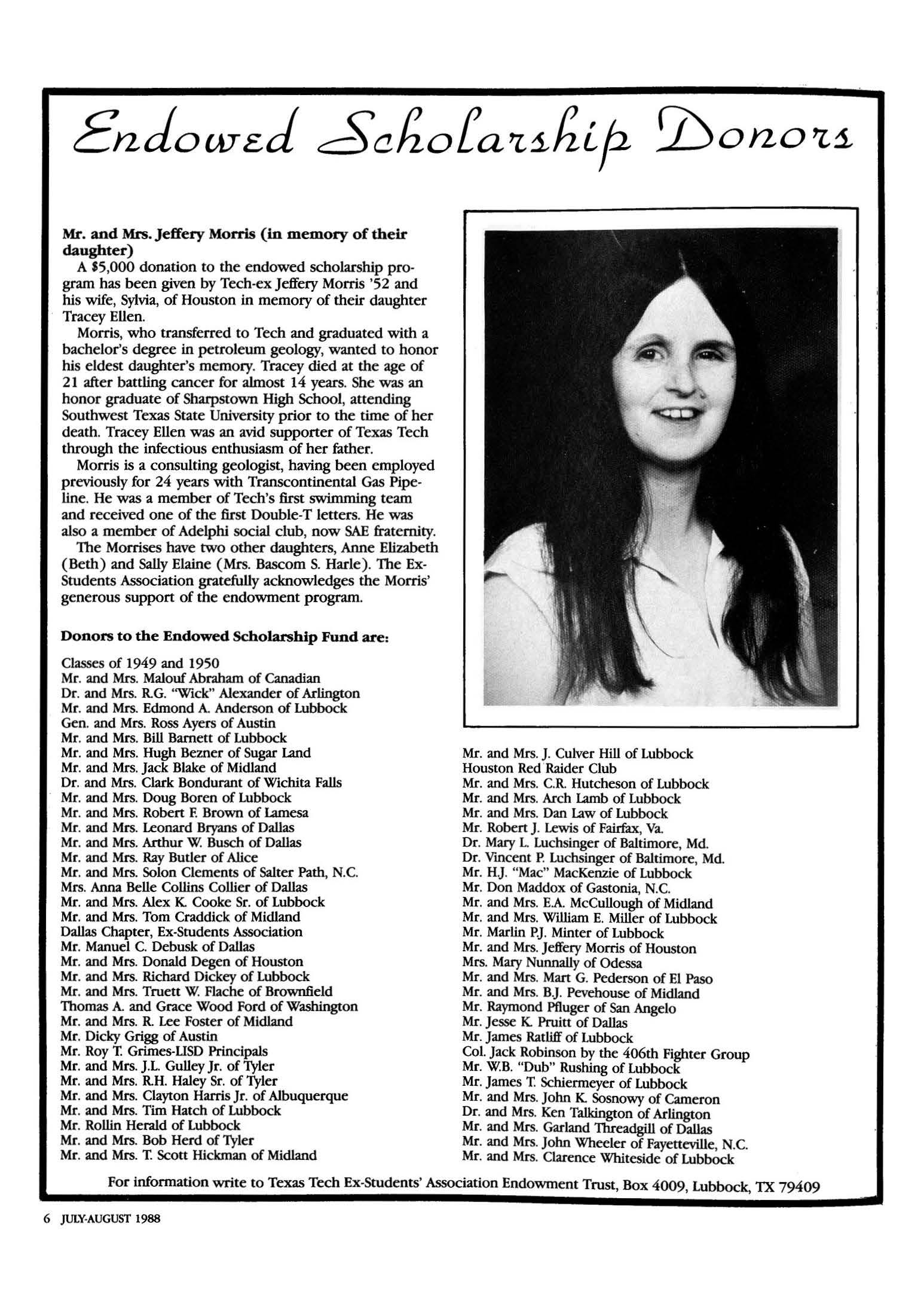 Morris, who transferred to Tech and graduated with a bachelor's degree in petroleum geology, wanted to honor his eldest daughter's memory Tracey died at the age of 21 after battling cancer for almost 14 years She was an honor graduate of Sharpstown High School, attending Southwest Texas State University prior to the time of her death Tracey Ellen was an avid s upporter of Texas Tech through the infectious enthusiasm of her father