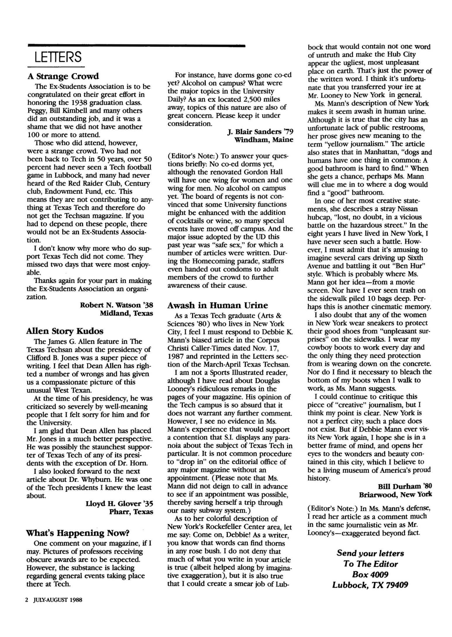 As a Texas Tech graduate ( Arts & Sciences '80) who lives in New York City, I feel I must respond to De bbie K Mann's biased article in the Corpus Christi Caller-Times dated Nov. 17, 1987 and reprinted in the Letters section of the March-April Texas Techsan