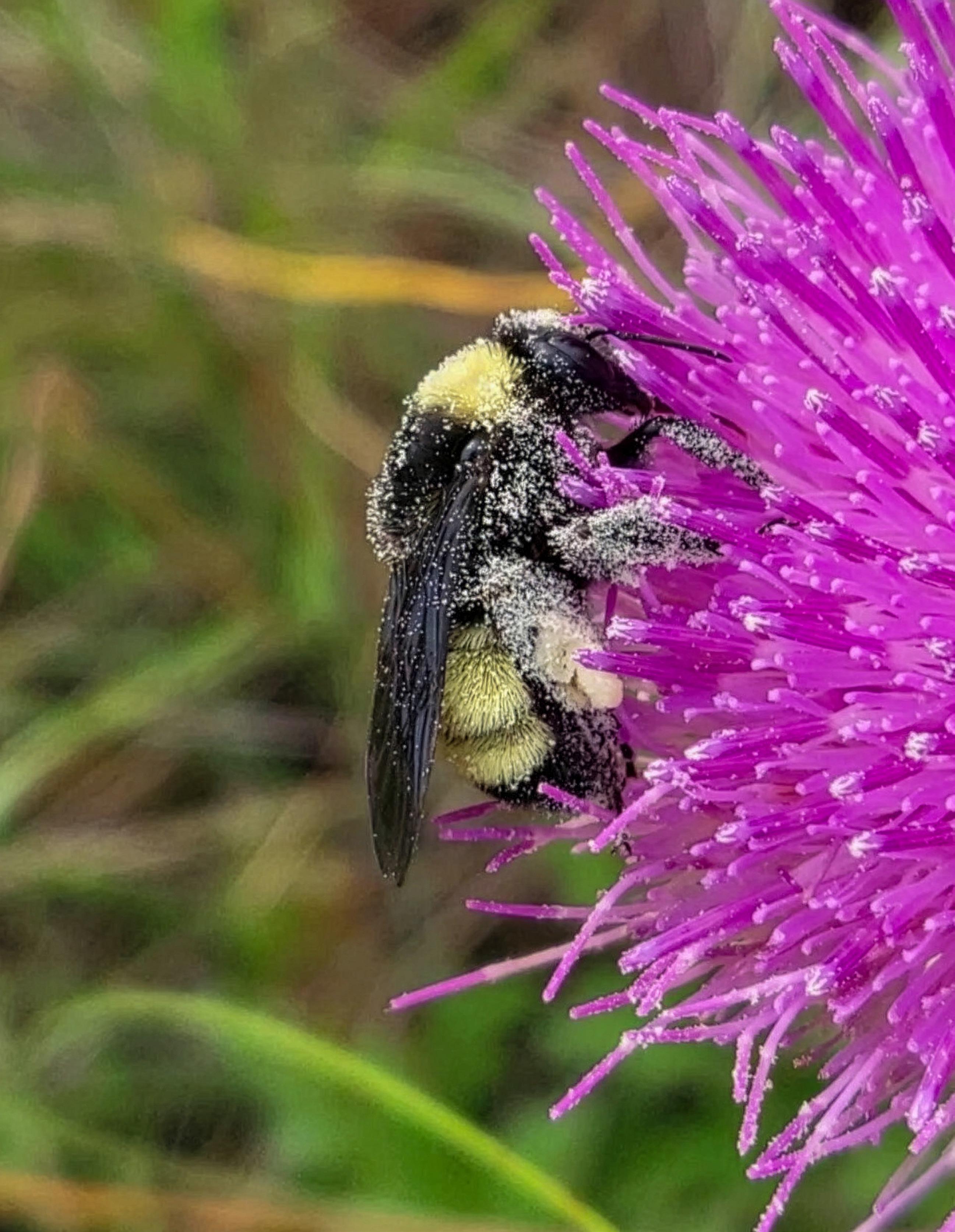 The American bumble bee is one of nine native species of bumble bees found in Texas. These critters are easily recognized by their fuzzy yellow and black bodies. Like honeybees, American bumble bees produce honey as a food reserve for their colonies to use when nectar is not available or when weather prevents worker bees from foraging. Their honey reserves are much smaller than those of other bees, so they must continuously search for nectar and pollen. In recent years there have been declines in native bumble bee populations. One factor is the loss of grasslands. Grasslands, like those in the Post Oak Savanna ecoregion, provide the diverse flowers and nest sites that native bumble bees need for survival. Bees are especially important to our natural ecosystems. They pollinate plants, benefiting the animals that depend on them and helping to reduce soil erosion by promoting plant growth. They also provide an estimated $3 billion annually to agriculture by pollinating crops. These insects play an important role in creating diverse, healthy, and balanced ecosystems that benefit us all.