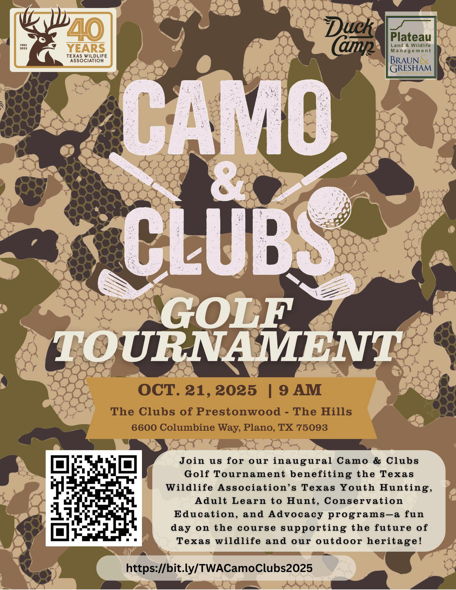 Inaugural TWA Camo & Clubs Golf Tournament, 9 a.m., The Clubs of Prestonwood—The Hills, Plano. https://bit.ly/TWACamoClubs2025